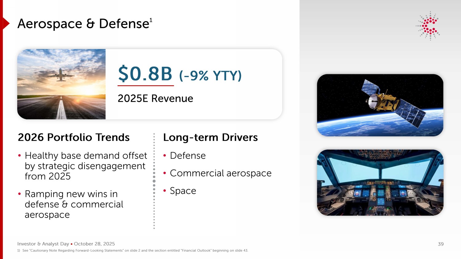 Investor & Analyst Day • October 28, 2025 Aerospace & Defense 1 2026 Portfolio Trends • Healthy base demand offset by strategic disengagement from 2025 • Ramping new wins in defense & commercial aerospace Long - term Drivers • Defense • Commercial aerospace • Space $0.8B ( - 9% YTY) 2025E Revenue 1) See “Cautionary Note Regarding Forward - Looking Statements” on slide 2 and the section entitled “Financial Outlook” beginning on slide 43. 39