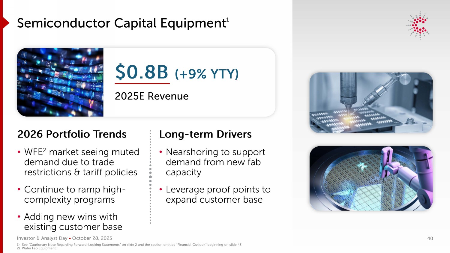 Investor & Analyst Day • October 28, 2025 Semiconductor Capital Equipment 1 2026 Portfolio Trends • WFE 2 market seeing muted demand due to trade restrictions & tariff policies • Continue to ramp high - complexity programs • Adding new wins with existing customer base Long - term Drivers • Nearshoring to support demand from new fab capacity • Leverage proof points to expand customer base $0.8B (+9% YTY) 2025E Revenue 1) See “Cautionary Note Regarding Forward - Looking Statements” on slide 2 and the section entitled “Financial Outlook” beginning on slide 43. 2) Wafer Fab Equipment. 40