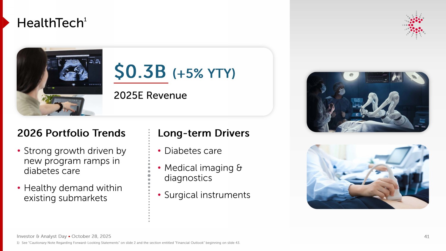 Investor & Analyst Day • October 28, 2025 HealthTech 1 2026 Portfolio Trends • Strong growth driven by new program ramps in diabetes care • Healthy demand within existing submarkets Long - term Drivers • Diabetes care • Medical imaging & diagnostics • Surgical instruments $0.3B (+5% YTY) 2025E Revenue 1) See “Cautionary Note Regarding Forward - Looking Statements” on slide 2 and the section entitled “Financial Outlook” beginning on slide 43. 41