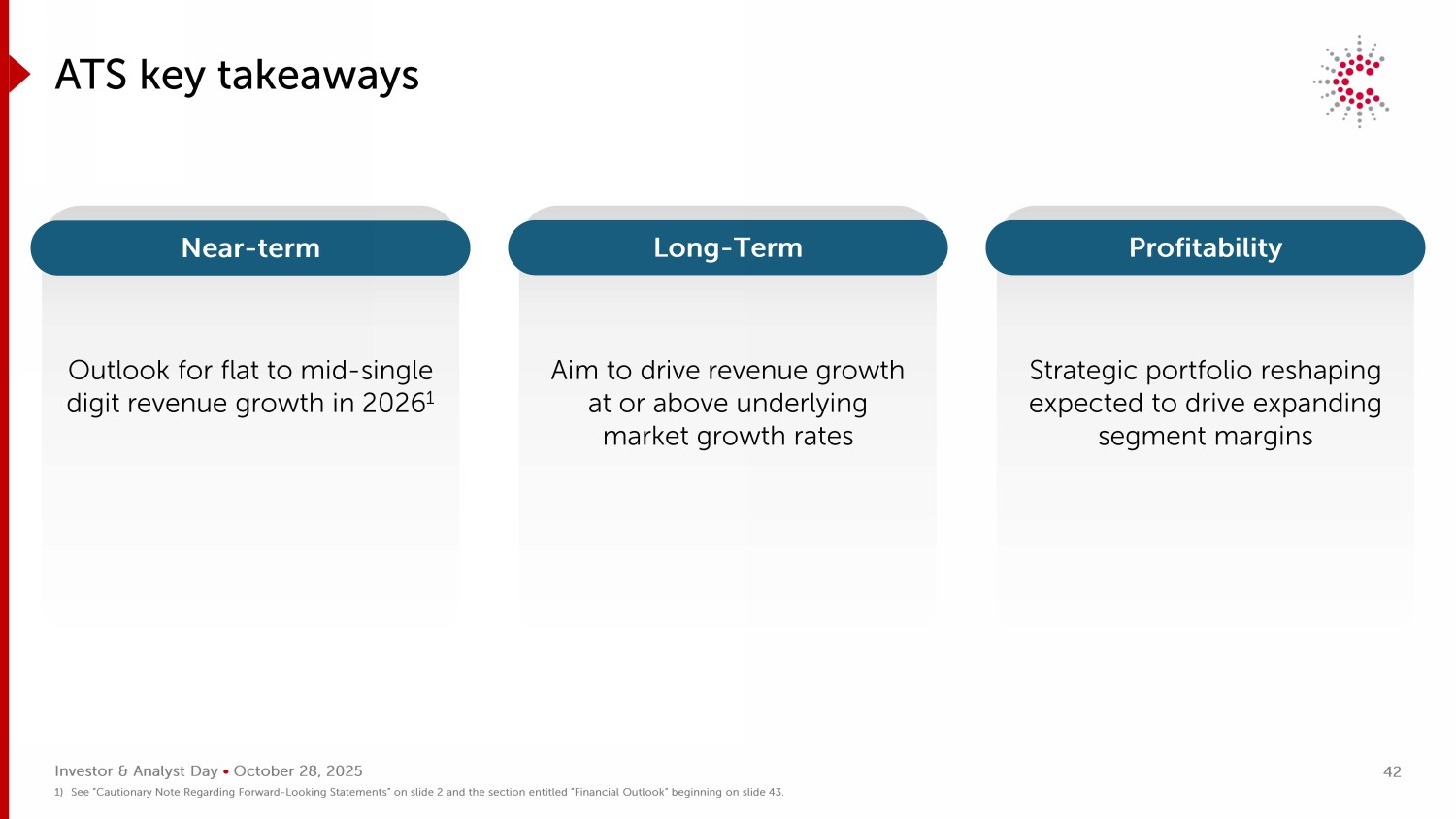 Investor & Analyst Day • October 28, 2025 Strategic portfolio reshaping expected to drive expanding segment margins Aim to drive revenue growth at or above underlying market growth rates Outlook for flat to mid - single digit revenue growth in 2026 1 ATS key takeaways Near - term Long - Term Profitability 1) See “Cautionary Note Regarding Forward - Looking Statements” on slide 2 and the section entitled “Financial Outlook” beginning on slide 43. 42
