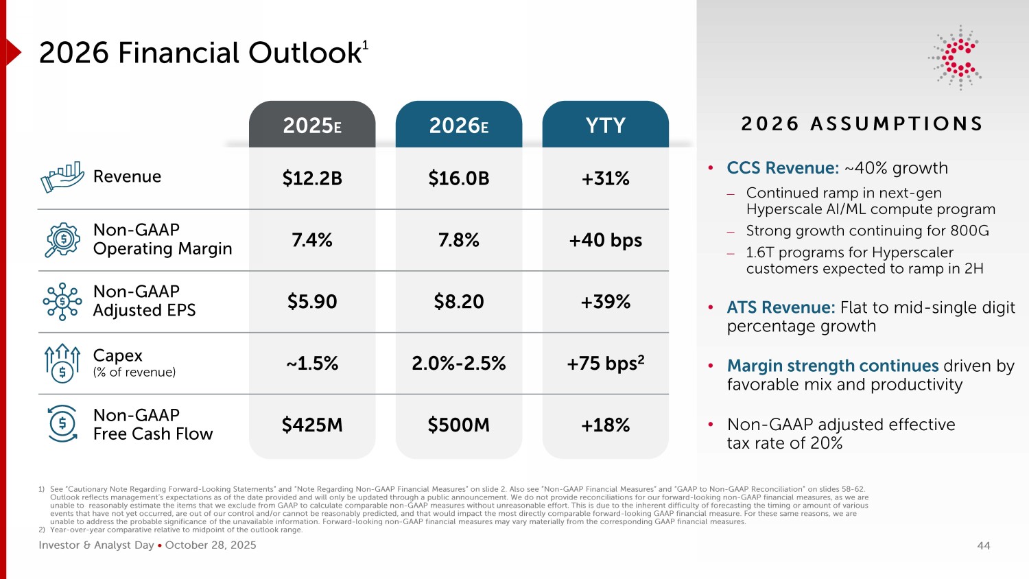 Investor & Analyst Day • October 28, 2025 2026 ASSUMPTIONS • CCS Revenue: ~40% growth ⎼ Continued ramp in next - gen Hyperscale AI/ML compute program ⎼ Strong growth continuing for 800G ⎼ 1.6T programs for Hyperscaler customers expected to ramp in 2H • ATS Revenue: Flat to mid - single digit percentage growth • Margin strength continues driven by favorable mix and productivity • Non - GAAP adjusted effective tax rate of 20% 2026 Financial Outlook 1 2025 E 2026 E YTY $12.2B 7.4% $5.90 ~1.5% $425M $16.0B 7.8% $8.20 2.0% - 2.5% $500M +31% +40 bps +39% +75 bps 2 +18% Revenue Non - GAAP Operating Margin Non - GAAP Adjusted EPS Capex (% of revenue) Non - GAAP Free Cash Flow 1) See “Cautionary Note Regarding Forward - Looking Statements” and “Note Regarding Non - GAAP Financial Measures” on slide 2. Also see “Non - GAAP Financial Measures” and “GAAP to Non - GAAP Reconciliation” on slides 58 - 62. Outlook reflects management’s expectations as of the date provided and will only be updated through a public announcement. We do not provide reconciliations for our forward - looking non - GAAP financial measures, as we are unable to reasonably estimate the items that we exclude from GAAP to calculate comparable non - GAAP measures without unreasonabl e effort. This is due to the inherent difficulty of forecasting the timing or amount of various events that have not yet occurred, are out of our control and/or cannot be reasonably predicted, and that would impact the mo st directly comparable forward - looking GAAP financial measure. For these same reasons, we are unable to address the probable significance of the unavailable information. Forward - looking non - GAAP financial measures may vary materially from the corresponding GAAP financial measures. 2) Year - over - year comparative relative to midpoint of the outlook range. 44