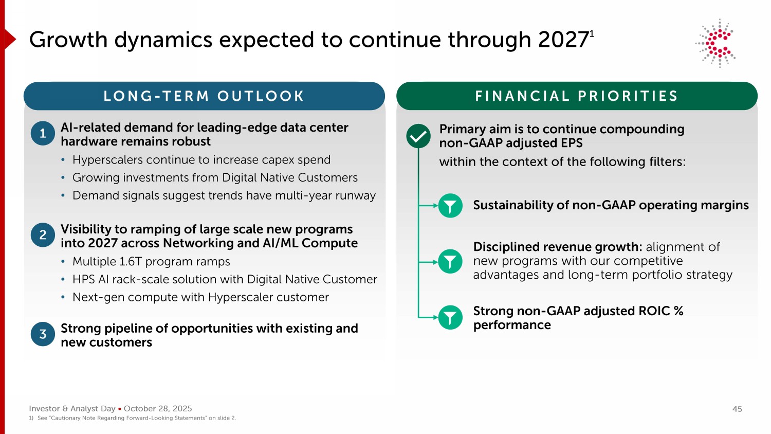 Investor & Analyst Day • October 28, 2025 Growth dynamics expected to continue through 2027 1 LONG - TERM OUTLOOK FINANCIAL PRIORITIES 1 AI - related demand for leading - edge data center hardware remains robust • Hyperscalers continue to increase capex spend • Growing investments from Digital Native Customers • Demand signals suggest trends have multi - year runway 2 Visibility to ramping of large scale new programs into 2027 across Networking and AI/ML Compute • Multiple 1.6T program ramps • HPS AI rack - scale solution with Digital Native Customer • Next - gen compute with Hyperscaler customer 3 Strong pipeline of opportunities with existing and new customers Primary aim is to continue compounding non - GAAP adjusted EPS within the context of the following filters: Sustainability of non - GAAP operating margins Disciplined revenue growth: alignment of new programs with our competitive advantages and long - term portfolio strategy Strong non - GAAP adjusted ROIC % performance 1) See “Cautionary Note Regarding Forward - Looking Statements” on slide 2. 45