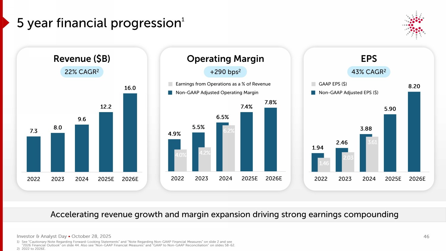 Investor & Analyst Day • October 28, 2025 1.94 2.46 3.88 5.90 8.20 1.46 2.03 3.61 2022 2023 2024 2025E 2026E 7.3 8.0 9.6 12.2 16.0 2022 2023 2024 2025E 2026E 4.9% 5.5% 6.5% 7.4% 7.8% 4.0% 4.2% 6.2% 2022 2023 2024 2025E 2026E 43% CAGR 2 5 year financial progression 1 Accelerating revenue growth and margin expansion driving strong earnings compounding Revenue ($B) Operating Margin EPS Earnings from Operations as a % of Revenue Non - GAAP Adjusted Operating Margin GAAP EPS ($) Non - GAAP Adjusted EPS ($) +290 bps 2 22% CAGR 2 1) See “Cautionary Note Regarding Forward - Looking Statements” and “Note Regarding Non - GAAP Financial Measures” on slide 2 and see “2026 Financial Outlook” on slide 44. Also see “Non - GAAP Financial Measures” and “GAAP to Non - GAAP Reconciliation” on slides 58 - 62. 2) 2022 to 2026E. 46