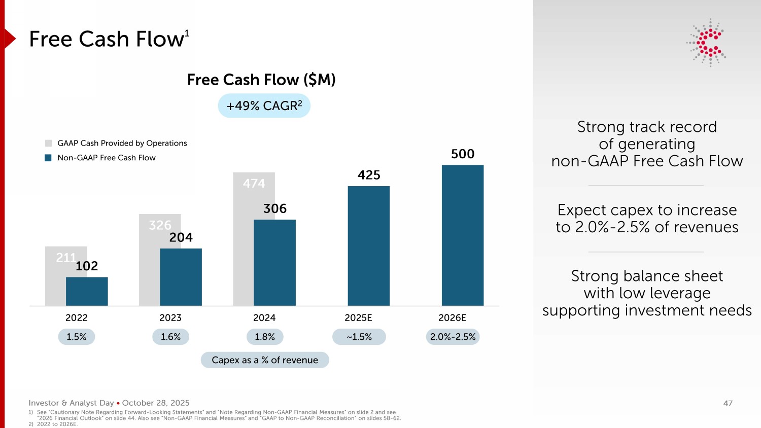 Investor & Analyst Day • October 28, 2025 ~1.5 % 211 326 474 102 204 306 425 500 2022 2023 2024 2025E 2026E Strong track record of generating non - GAAP Free Cash Flow Expect capex to increase to 2.0% - 2.5% of revenues Strong balance sheet with low leverage supporting investment needs Free Cash Flow 1 Free Cash Flow ($M) +49% CAGR 2 1.5% 2.0 % - 2 .5 % 1.8% 1.6% Capex as a % of revenue GAAP Cash Provided by Operations Non - GAAP Free Cash Flow 1) See “Cautionary Note Regarding Forward - Looking Statements” and “Note Regarding Non - GAAP Financial Measures” on slide 2 and see “2026 Financial Outlook” on slide 44. Also see “Non - GAAP Financial Measures” and “GAAP to Non - GAAP Reconciliation” on slides 58 - 62. 2) 2022 to 2026E. 47