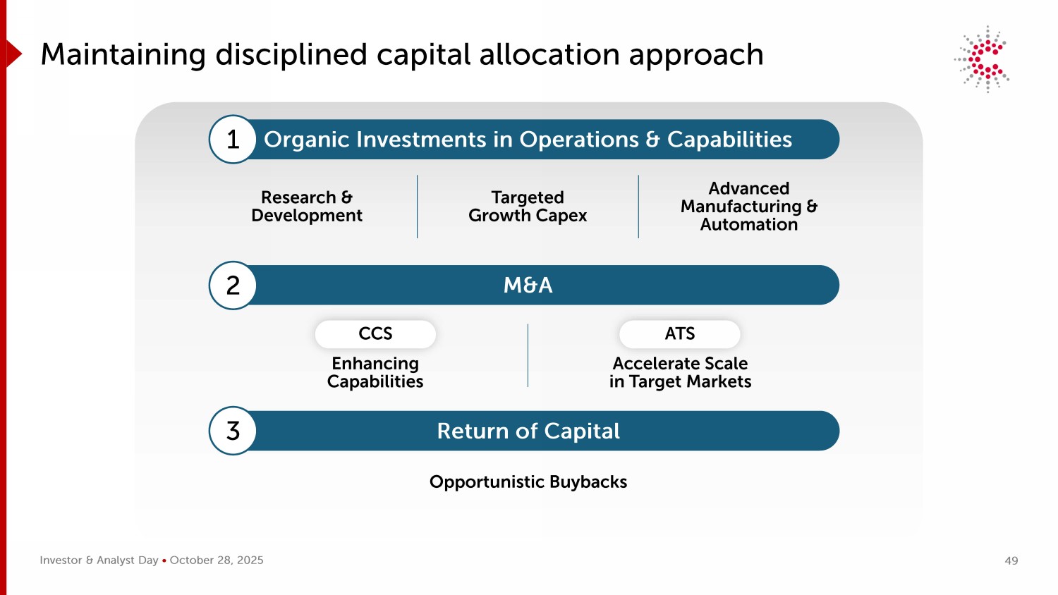 Investor & Analyst Day • October 28, 2025 Maintaining disciplined capital allocation approach Organic Investments in Operations & Capabilities Research & Development Targeted Growth Capex Advanced Manufacturing & Automation M&A Enhancing Capabilities Accelerate Scale in Target Markets Return of Capital Opportunistic Buybacks CCS ATS 1 2 3 49