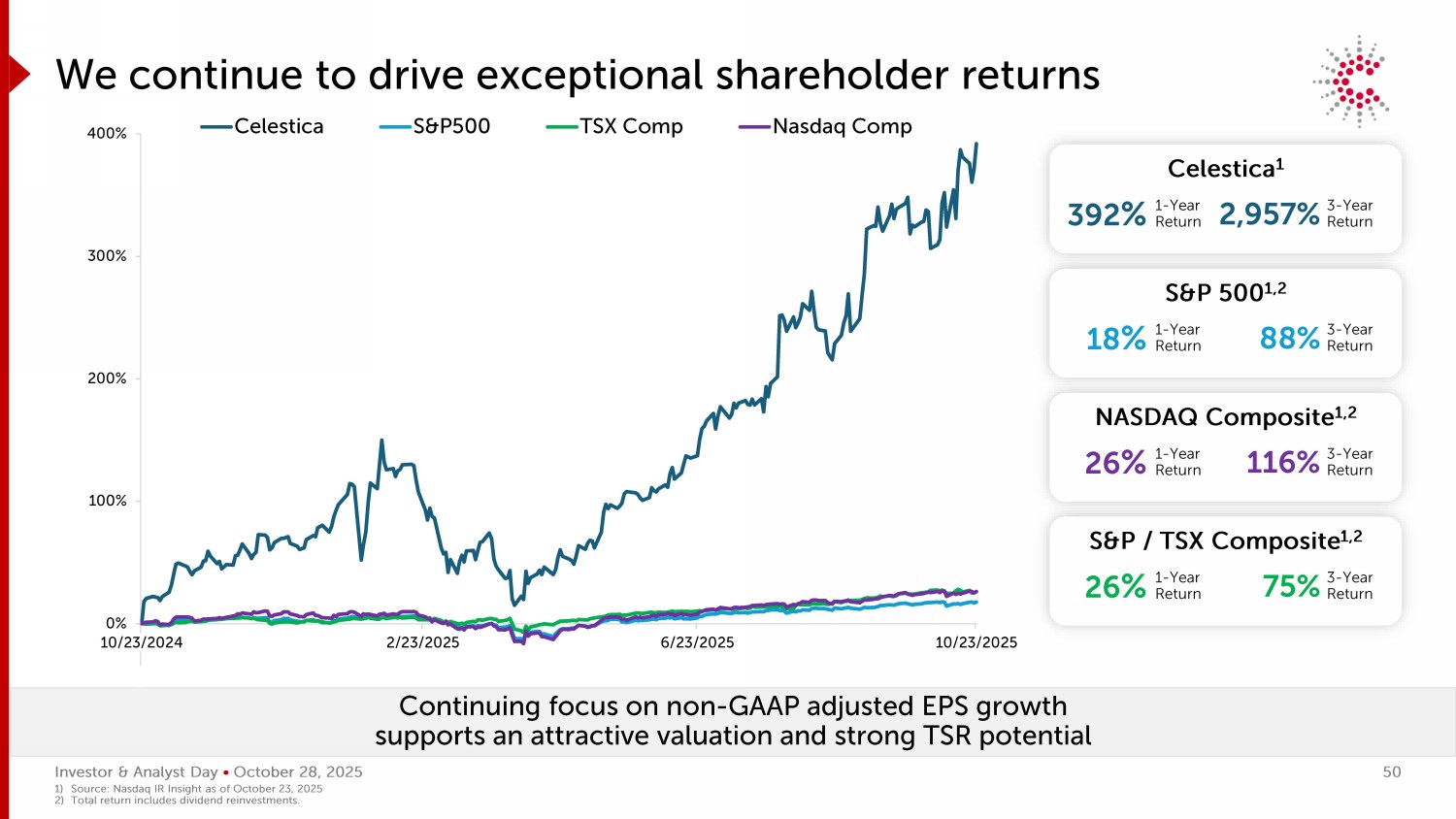 Investor & Analyst Day • October 28, 2025 -100% 0% 100% 200% 300% 400% 10/23/2024 2/23/2025 6/23/2025 10/23/2025 Celestica S&P500 TSX Comp Nasdaq Comp We continue to drive exceptional shareholder returns Celestica 1 392 % 1 - Year Return 2,957% 3 - Year Return S&P 500 1,2 18 % 1 - Year Return 88% 3 - Year Return S&P / TSX Composite 1,2 26 % 1 - Year Return 75% 3 - Year Return NASDAQ Composite 1,2 26 % 1 - Year Return 116% 3 - Year Return Investor & Analyst Day • October 28, 2025 Continuing focus on non - GAAP adjusted EPS growth supports an attractive valuation and strong TSR potential 1) Source: Nasdaq IR Insight as of October 23, 2025 2) Total return includes dividend reinvestments. 50