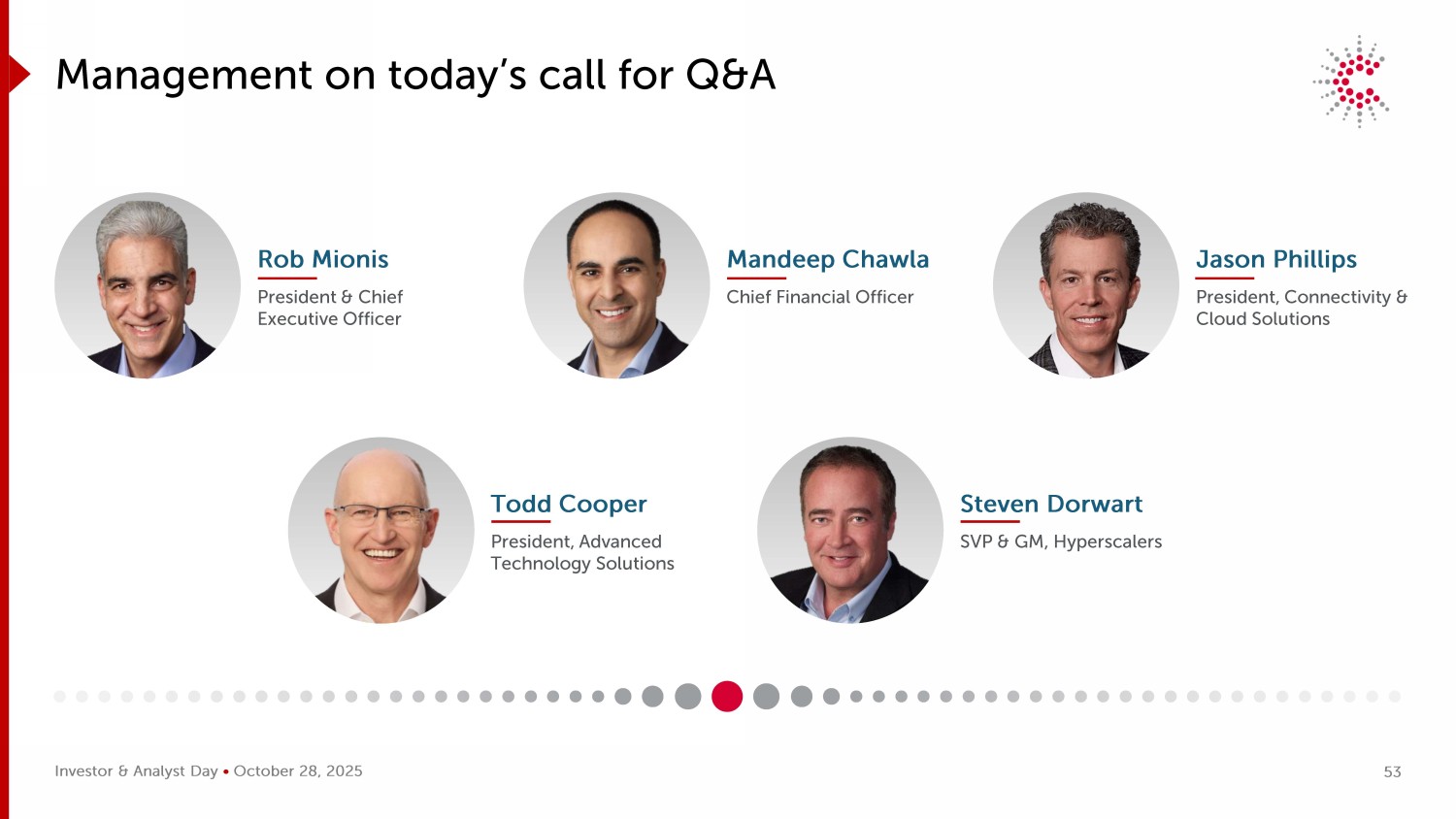 Investor & Analyst Day • October 28, 2025 Management on today’s call for Q&A Rob Mionis President & Chief Executive Officer Mandeep Chawla Chief Financial Officer Jason Phillips President, Connectivity & Cloud Solutions Steven Dorwart SVP & GM, Hyperscalers Todd Cooper President, Advanced Technology Solutions 53