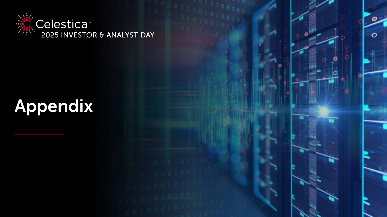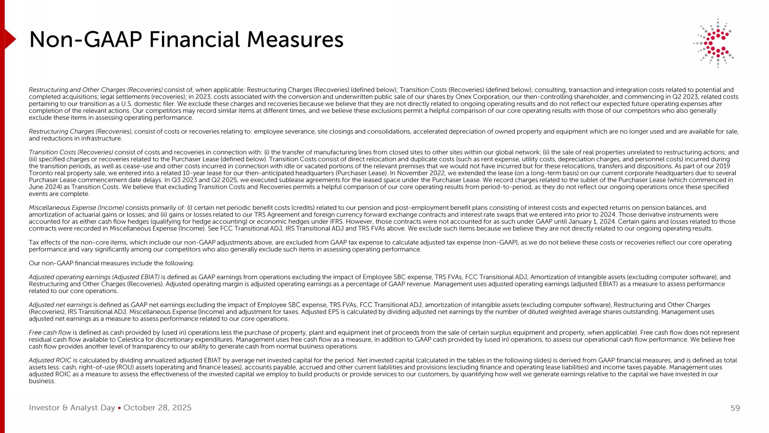 Investor & Analyst Day • October 28, 2025 Non - GAAP Financial Measures Restructuring and Other Charges (Recoveries) consist of, when applicable: Restructuring Charges (Recoveries) (defined below); Transition Costs (Recoveries) (defined below ); consulting, transaction and integration costs related to potential and completed acquisitions; legal settlements (recoveries); in 2023, costs associated with the conversion and underwritten public sa le of our shares by Onex Corporation, our then - controlling shareholder, and commencing in Q2 2023, related costs pertaining to our transition as a U.S. domestic filer. We exclude these charges and recoveries because we believe that they a re not directly related to ongoing operating results and do not reflect our expected future operating expenses after completion of the relevant actions. Our competitors may record similar items at different times, and we believe these exclusi ons permit a helpful comparison of our core operating results with those of our competitors who also generally exclude these items in assessing operating performance. Restructuring Charges (Recoveries) , consist of costs or recoveries relating to: employee severance, site closings and consolidations, accelerated depreciation of owned property and equipment which are no longer used and are available for sale, and reductions in infrastructure. Transition Costs (Recoveries) consist of costs and recoveries in connection with: ( i ) the transfer of manufacturing lines from closed sites to other sites within our global network; (ii) the sale of real prope rti es unrelated to restructuring actions; and (iii) specified charges or recoveries related to the Purchaser Lease (defined below). Transition Costs consist of direct relo cat ion and duplicate costs (such as rent expense, utility costs, depreciation charges, and personnel costs) incurred during the transition periods, as well as cease - use and other costs incurred in connection with idle or vacated portions of the relevan t premises that we would not have incurred but for these relocations, transfers and dispositions. As part of our 2019 Toronto real property sale, we entered into a related 10 - year lease for our then - anticipated headquarters (Purchaser Lease). In November 2022, we extended the lease (on a long - term basis) on our current corporate headquarters due to several Purchaser Lease commencement date delays. In Q3 2023 and Q2 2025, we executed sublease agreements for the leased space under the Purchaser Lease. We record charges related to the sublet of the Purchaser Lease (which commenced in June 2024) as Transition Costs. We believe that excluding Transition Costs and Recoveries permits a helpful comparison of our co re operating results from period - to - period, as they do not reflect our ongoing operations once these specified events are complete. Miscellaneous Expense (Income) consists primarily of: ( i ) certain net periodic benefit costs (credits) related to our pension and post - employment benefit plans consisting of interest c osts and expected returns on pension balances, and amortization of actuarial gains or losses; and (ii) gains or losses related to our TRS Agreement and foreign currency forward ex change contracts and interest rate swaps that we entered into prior to 2024. Those derivative instruments were accounted for as either cash flow hedges (qualifying for hedge accounting) or economic hedges under IFRS. However, those cont rac ts were not accounted for as such under GAAP until January 1, 2024. Certain gains and losses related to those contracts were recorded in Miscellaneous Expense (Income). See FCC Transitional ADJ, IRS Transitional ADJ and TRS FVAs above. We exclude such items because we believe they are not directly related to our ongoing operating results. Tax effects of the non - core items, which include our non - GAAP adjustments above, are excluded from GAAP tax expense to calculate adjusted tax expense (non - GAAP), as we do not believe these costs or recoveries reflect our core operating performance and vary significantly among our competitors who also generally exclude such items in assessing operating perform anc e. Our non - GAAP financial measures include the following: Adjusted operating earnings (Adjusted EBIAT) is defined as GAAP earnings from operations excluding the impact of Employee SBC expense, TRS FVAs, FCC Transitional ADJ, Amo rt ization of intangible assets (excluding computer software), and Restructuring and Other Charges (Recoveries). Adjusted operating margin is adjusted operating earnings as a percentage of GAA P r evenue. Management uses adjusted operating earnings (adjusted EBIAT) as a measure to assess performance related to our core operations. Adjusted net earnings is defined as GAAP net earnings excluding the impact of Employee SBC expense, TRS FVAs, FCC Transitional ADJ, amortization of i ntangible assets (excluding computer software), Restructuring and Other Charges (Recoveries), IRS Transitional ADJ, Miscellaneous Expense (Income) and adjustment for taxes. Adjusted EPS is calculated by di vid ing adjusted net earnings by the number of diluted weighted average shares outstanding. Management uses adjusted net earnings as a measure to assess performance related to our core operations. Free cash flow is defined as cash provided by (used in) operations less the purchase of property, plant and equipment (net of proceeds from th e sale of certain surplus equipment and property, when applicable). Free cash flow does not represent residual cash flow available to Celestica for discretionary expenditures. Management uses free cash flow as a measure, in add iti on to GAAP cash provided by (used in) operations, to assess our operational cash flow performance. We believe free cash flow provides another level of transparency to our ability to generate cash from normal business operations. Adjusted ROIC is calculated by dividing annualized adjusted EBIAT by average n