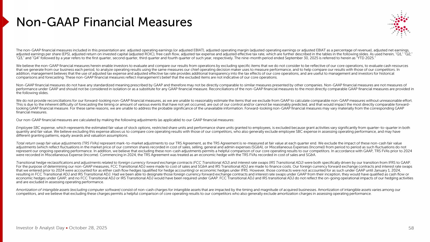 Investor & Analyst Day • October 28, 2025 Non - GAAP Financial Measures The non - GAAP financial measures included in this presentation are: adjusted operating earnings (or adjusted EBIAT), adjusted ope rating margin (adjusted operating earnings or adjusted EBIAT as a percentage of revenue), adjusted net earnings, adjusted earnings per share (EPS), adjusted return on invested capital (adjusted ROIC), free cash flow, adjusted tax expense and adjusted effective tax rate, which are further described in the tables in the following slides. As used herein, "Q1," "Q2," "Q3," and "Q4" followed by a year refers to the first quarter, second quarter, third quarter and fourth quarter of such year, re spectively. The nine - month period ended September 30, 2025 is referred to herein as “YTD 2025.” We believe the non - GAAP financial measures herein enable investors to evaluate and compare our results from operations by exclud ing specific items that we do not consider to be reflective of our core operations, to evaluate cash resources that we generate from our business each period, to analyze operating results using the same measures our chief operating deci sio n maker uses to measure performance, and to help compare our results with those of our competitors. In addition, management believes that the use of adjusted tax expense and adjusted effective tax rate provides additional transp are ncy into the tax effects of our core operations, and are useful to management and investors for historical comparisons and forecasting. These non - GAAP financial measures reflect management’s belief that the excluded items are not indic ative of our core operations. Non - GAAP financial measures do not have any standardized meaning prescribed by GAAP and therefore may not be directly comparable to similar measures presented by other companies. Non - GAAP financial measures are not measures of performance under GAAP and should not be considered in isolation or as a substitute for any GAAP financial measure. Reconcili ati ons of the non - GAAP financial measures to the most directly comparable GAAP financial measures are provided in the following slides. We do not provide reconciliations for our forward - looking non - GAAP financial measures, as we are unable to reasonably estimate t he items that we exclude from GAAP to calculate comparable non - GAAP measures without unreasonable effort. This is due to the inherent difficulty of forecasting the timing or amount of various events that have not yet occurred, are out of our control and/or cannot be reasonably predicted, and that would impact the most directly comparable forward - looking GAAP financial measure. For these same reasons, we are unable to address the probable significance of the unavailable in formation. Forward - looking non - GAAP financial measures may vary materially from the corresponding GAAP financial measures. Our non - GAAP financial measures are calculated by making the following adjustments (as applicable) to our GAAP financial measure s: Employee SBC expense , which represents the estimated fair value of stock options, restricted share units and performance share units granted to e mpl oyees, is excluded because grant activities vary significantly from quarter - to - quarter in both quantity and fair value. We believe excluding this expense allows us to compare core operating results with those of our comp eti tors, who also generally exclude employee SBC expense in assessing operating performance, and may have different granting patterns, equity awards and valuation assumptions. Total return swap fair value adjustments (TRS FVAs) represent mark - to - market adjustments to our TRS Agreement, as the TRS Agreement is re - measured at fair value at each quarter en d. We exclude the impact of these non - cash fair value adjustments (which reflect fluctuations in the market price of our common shares recorded in cost of sales, selling, general and admin expenses (SG&A), or Miscellaneous Expenses (Income)) from period to period as such fluctuations do not represent our ongoing operating performance. In addition, we believe that excluding these non - cash adjustments permits a helpful comparison of our core operating results to our competitors. In accordance with GAAP, TRS FVAs prior to 2024 were recorded in Miscellaneous Expense (Income). Commencing in 2024, the TRS Agreement was treated as an economic hedge with the TRS FVAs recorded in cost of sales and SG&A. Transitional hedge reclassifications and adjustments related to foreign currency forward exchange contracts (FCC Transitional AD J) and interest rate swaps (IRS Transitional ADJ) were both specifically driven by our transition from IFRS to GAAP. For the purpose of determining our non - GAAP measures, FCC Transitional ADJ were made to cost of sales and SG&A and IRS Transitio nal ADJ are made to finance costs. Our foreign currency forward exchange contracts and interest rate swaps that we entered prior to 2024 were accounted for as either cash flow hedges (qualified for hedge accounting) or economic hedg es under IFRS. However, those contracts were not accounted for as such under GAAP until January 1, 2024, resulting in FCC Transitional ADJ and IRS Transitional ADJ. Had we been able to designate those foreign currency forward exch ang e contracts and interest rate swaps under GAAP from their inception, they would have qualified as cash flow or economic hedges under GAAP, and no FCC Transitional ADJ or IRS Transitional ADJ would have been required under GAAP. FCC Tran sit ional ADJ and IRS transitional ADJ do not reflect the on - going operational impacts of our hedging activities and are excluded in assessing operating performance. Amortization of intangible assets (excluding computer software) consist of non - cash charges for intangible assets that are impacted by the timing and magnitude of acquired businesses. Amortiz ation of intangible assets varies among our competitors, and 