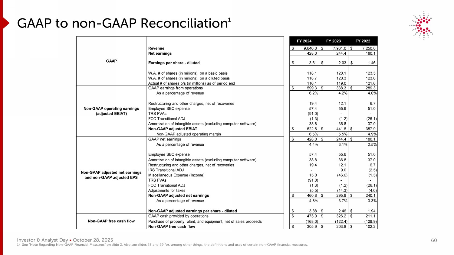 Investor & Analyst Day • October 28, 2025 FY 2024 FY 2023 FY 2022 Revenue 9,646.0$ 7,961.0$ 7,250.0$ Net earnings 428.0 244.4 180.1 Earnings per share - diluted 3.61$ 2.03$ 1.46$ W.A. # of shares (in millions), on a basic basis 118.1 120.1 123.5 W.A. # of shares (in millions), on a diluted basis 118.7 120.3 123.6 Actual # of shares o/s (in millions) as of period end 116.1 119.0 121.6 GAAP earnings from operations 599.3$ 338.3$ 289.3$ As a percentage of revenue 6.2% 4.2% 4.0% Restructuring and other charges, net of recoveries 19.4 12.1 6.7 Employee SBC expense 57.4 55.6 51.0 TRS FVAs (91.0) - - FCC Transitional ADJ (1.3) (1.2) (26.1) Amortization of intangible assets (excluding computer software) 38.8 36.8 37.0 Non-GAAP adjusted EBIAT 622.6$ 441.6$ 357.9$ Non-GAAP adjusted operating margin 6.5% 5.5% 4.9% GAAP net earnings 428.0$ 244.4$ 180.1$ As a percentage of revenue 4.4% 3.1% 2.5% Employee SBC expense 57.4 55.6 51.0 Amortization of intangible assets (excluding computer software) 38.8 36.8 37.0 Restructuring and other charges, net of recoveries 19.4 12.1 6.7 IRS Transitional ADJ - 9.0 (2.5) Miscellaneous Expense (Income) 15.0 (46.6) (1.5) TRS FVAs (91.0) - - FCC Transitional ADJ (1.3) (1.2) (26.1) Adjustments for taxes (5.5) (14.3) (4.6) Non-GAAP adjusted net earnings 460.8$ 295.8$ 240.1$ As a percentage of revenue 4.8% 3.7% 3.3% Non-GAAP adjusted earnings per share - diluted 3.88$ 2.46$ 1.94$ GAAP cash provided by operations 473.9$ 326.2$ 211.1$ Purchase of property, plant, and equipment, net of sales proceeds (168.0) (122.4) (108.9) Non-GAAP free cash flow 305.9$ 203.8$ 102.2$ GAAP Non-GAAP adjusted net earnings and non-GAAP adjusted EPS Non-GAAP free cash flow Non-GAAP operating earnings (adjusted EBIAT) GAAP to non - GAAP Reconciliation 1 1) See “Note Regarding Non - GAAP Financial Measures” on slide 2. Also see slides 58 and 59 for, among other things, the definitions and uses of certain non - GAAP financial measures. 60