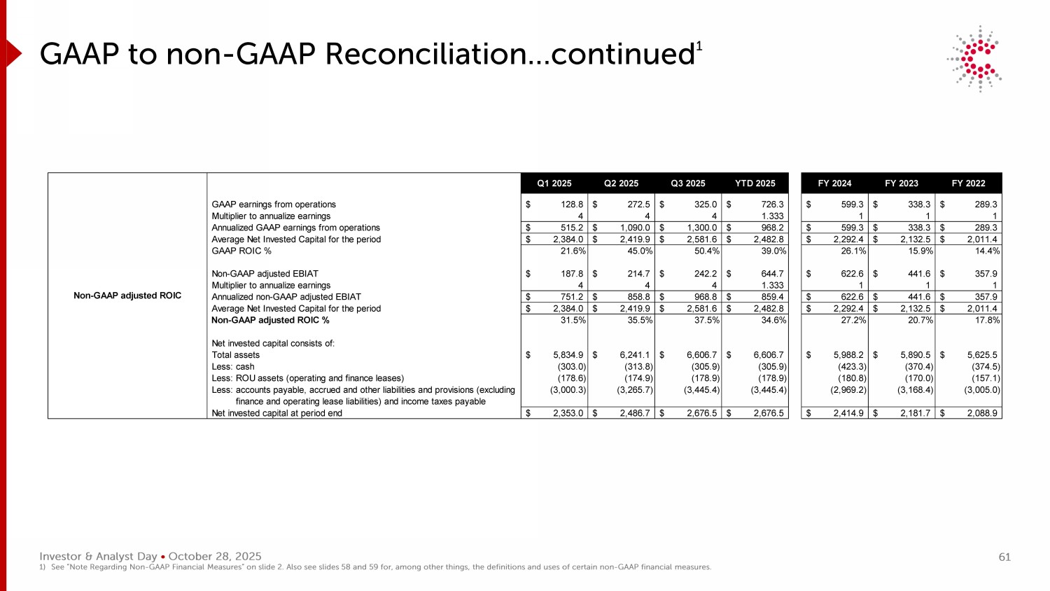 Investor & Analyst Day • October 28, 2025 Q1 2025 Q2 2025 Q3 2025 YTD 2025 FY 2024 FY 2023 FY 2022 GAAP earnings from operations 128.8$ 272.5$ 325.0$ 726.3$ 599.3$ 338.3$ 289.3$ Multiplier to annualize earnings 4 4 4 1.333 1 1 1 Annualized GAAP earnings from operations 515.2$ 1,090.0$ 1,300.0$ 968.2$ 599.3$ 338.3$ 289.3$ Average Net Invested Capital for the period 2,384.0$ 2,419.9$ 2,581.6$ 2,482.8$ 2,292.4$ 2,132.5$ 2,011.4$ GAAP ROIC % 21.6% 45.0% 50.4% 39.0% 26.1% 15.9% 14.4% Non-GAAP adjusted EBIAT 187.8$ 214.7$ 242.2$ 644.7$ 622.6$ 441.6$ 357.9$ Multiplier to annualize earnings 4 4 4 1.333 1 1 1 Annualized non-GAAP adjusted EBIAT 751.2$ 858.8$ 968.8$ 859.4$ 622.6$ 441.6$ 357.9$ Average Net Invested Capital for the period 2,384.0$ 2,419.9$ 2,581.6$ 2,482.8$ 2,292.4$ 2,132.5$ 2,011.4$ Non-GAAP adjusted ROIC % 31.5% 35.5% 37.5% 34.6% 27.2% 20.7% 17.8% Net invested capital consists of: Total assets 5,834.9$ 6,241.1$ 6,606.7$ 6,606.7$ 5,988.2$ 5,890.5$ 5,625.5$ Less: cash (303.0) (313.8) (305.9) (305.9) (423.3) (370.4) (374.5) Less: ROU assets (operating and finance leases) (178.6) (174.9) (178.9) (178.9) (180.8) (170.0) (157.1) Less: accounts payable, accrued and other liabilities and provisions (excluding (3,000.3) (3,265.7) (3,445.4) (3,445.4) (2,969.2) (3,168.4) (3,005.0) finance and operating lease liabilities) and income taxes payable Net invested capital at period end 2,353.0$ 2,486.7$ 2,676.5$ 2,676.5$ 2,414.9$ 2,181.7$ 2,088.9$ Non-GAAP adjusted ROIC GAAP to non - GAAP Reconciliation…continued 1 1) See “Note Regarding Non - GAAP Financial Measures” on slide 2. Also see slides 58 and 59 for, among other things, the definitions and uses of certain non - GAAP financial measures. 61