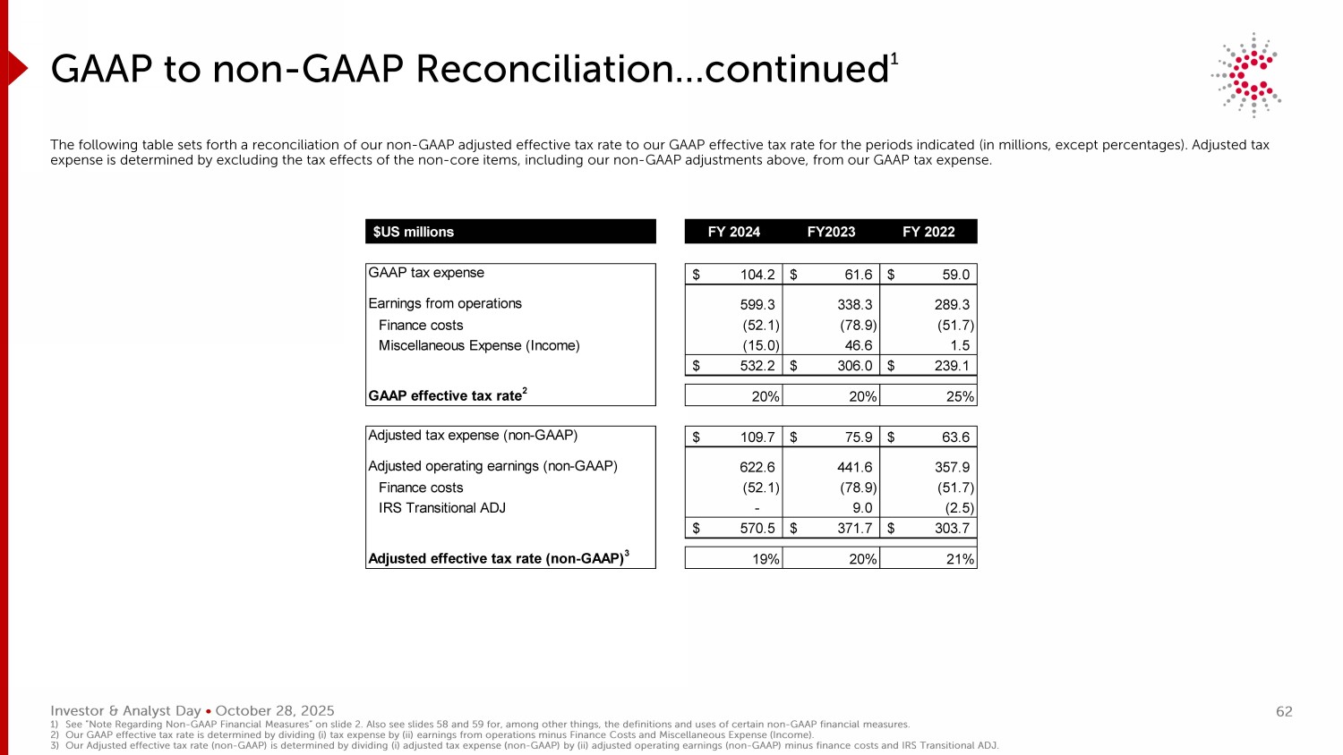 Investor & Analyst Day • October 28, 2025 GAAP to non - GAAP Reconciliation…continued 1 The following table sets forth a reconciliation of our non - GAAP adjusted effective tax rate to our GAAP effective tax rate for t he periods indicated (in millions, except percentages). Adjusted tax expense is determined by excluding the tax effects of the non - core items, including our non - GAAP adjustments above, from our GAA P tax expense. 1) See “Note Regarding Non - GAAP Financial Measures” on slide 2. Also see slides 58 and 59 for, among other things, the definitions and uses of certain non - GAAP financial measures. 2) Our GAAP effective tax rate is determined by dividing ( i ) tax expense by (ii) earnings from operations minus Finance Costs and Miscellaneous Expense (Income). 3) Our Adjusted effective tax rate (non - GAAP) is determined by dividing ( i ) adjusted tax expense (non - GAAP) by (ii) adjusted operating earnings (non - GAAP) minus finance costs and IRS Transitional ADJ. $US millions FY 2024 FY2023 FY 2022 GAAP tax expense 104.2$ 61.6$ 59.0$ Earnings from operations 599.3 338.3 289.3 Finance costs (52.1) (78.9) (51.7) Miscellaneous Expense (Income) (15.0) 46.6 1.5 532.2$ 306.0$ 239.1$ GAAP effective tax rate 2 20% 20% 25% Adjusted tax expense (non-GAAP) 109.7$ 75.9$ 63.6$ Adjusted operating earnings (non-GAAP) 622.6 441.6 357.9 Finance costs (52.1) (78.9) (51.7) IRS Transitional ADJ - 9.0 (2.5) 570.5$ 371.7$ 303.7$ Adjusted effective tax rate (non-GAAP) 3 19% 20% 21% 62