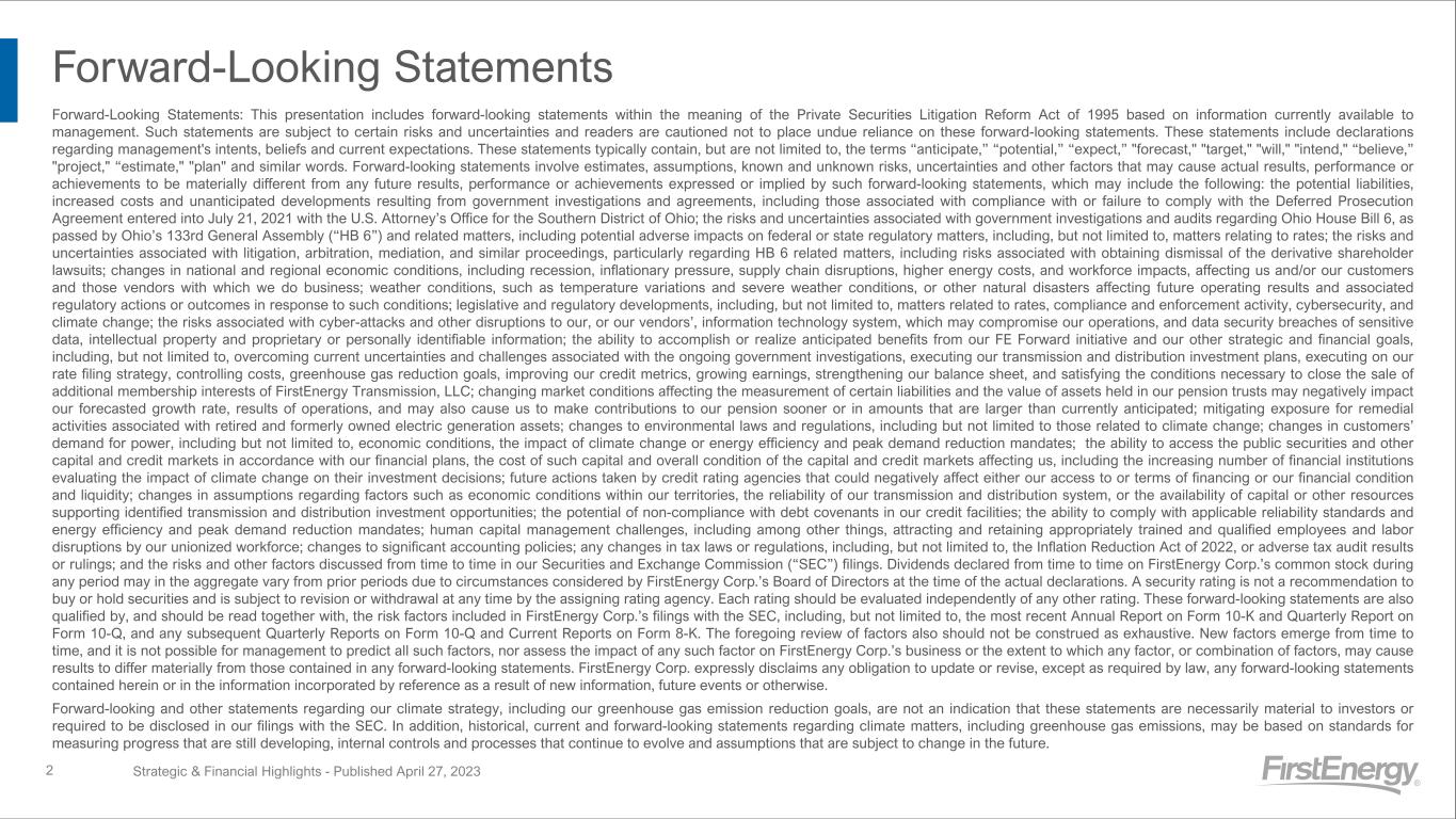 1 EPS Variance Analysis Regulated Regulated Corporate / FirstEnergy Corp. (in millions, except per share amounts) Distribution Transmission Other Consolidated 2022 Earnings (Loss) Attributable to FirstEnergy Corp. (GAAP) $265 $125 $(102) $288 2022 Basic Earnings (Loss) Per Share (avg. shares outstanding 570M) $0.47 $0.22 $(0.18) $0.51 Special Items - 2022 Regulatory charges 0.01 — — 0.01 Debt-related costs — — 0.06 0.06 Strategic transaction charges — — 0.01 0.01 Investigation and other related costs — — 0.01 0.01 Total Special Items - 2022 0.01 — 0.08 0.09 2022 Operating Earnings (Loss) Per Share - Non-GAAP $0.48 0.22 $(0.10) $0.60 Investments 0.02 0.03 — 0.05 Customer demand (0.06) — — (0.06) O&M 0.03 — — 0.03 Pension/OPEB (0.06) — (0.02) (0.08) Financing plan (0.02) — 0.03 0.01 FET 19.9% Interest Sale — (0.03) — (0.03) Other 0.03 (0.01) — 0.02 Signal Peak — — 0.06 0.06 2023 Operating Earnings (Loss) Per Share - Non-GAAP $0.42 0.21 $(0.03) $0.60 Special Items - 2023 Regulatory charges — (0.01) — (0.01) FE Forward cost to achieve (0.01) — (0.04) (0.05) Investigation and other related costs — — (0.03) (0.03) Total Special Items - 2023 (0.01) (0.01) (0.07) (0.09) 2023 Basic Earnings (Loss) Per Share (avg. shares outstanding 572M) $0.41 $0.20 $(0.10) $0.51 2023 Earnings (Loss) Attributable to FirstEnergy Corp. (GAAP) $236 $114 $(58) $292 Per share amounts for the special items and earnings drivers above and throughout this report are based on the after-tax effect of each item divided by the number of shares outstanding for the period. The current and deferred income tax effect was calculated by applying the subsidiaries' statutory tax rate to the pre-tax amount if deductible/taxable. The income tax rates range from 21% to 29% in 2023 and 2022. First Quarter Summary First Quarter Reconciliation 2023 2022 Change GAAP Earnings Per Basic Share $0.51 $0.51 $— Special Items $0.09 $0.09 $— Operating (Non-GAAP) Earnings Per Share $0.60 $0.60 $— Note: Refer to slide 3 for information on Non-GAAP Financial Matters. Strategic & Financial Highlights - Published April 27, 202310
