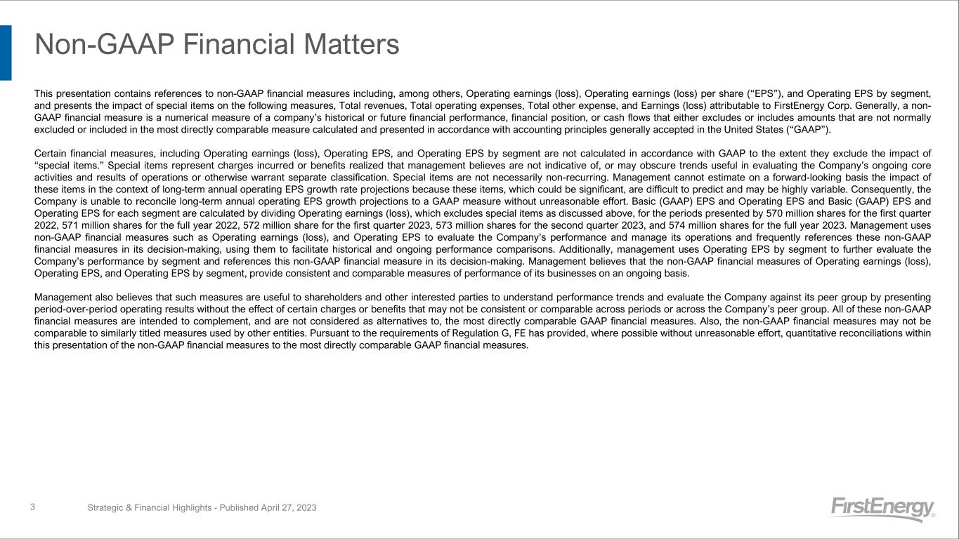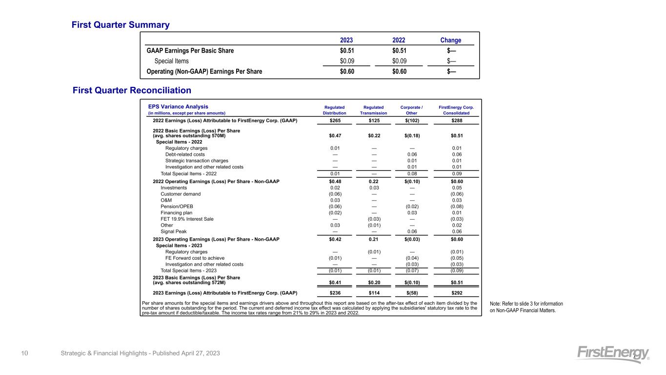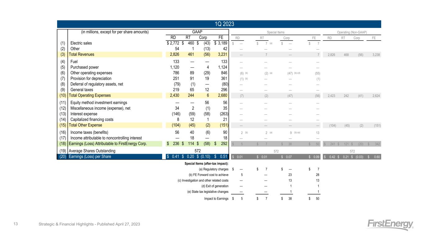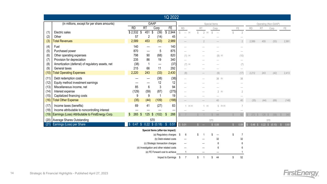 1Q 2023 (in millions, except for per share amounts) GAAP Special Items Operating (Non-GAAP) RD RT Corp FE RD RT Corp FE RD RT Corp FE (1) Electric sales $ 2,772 $ 460 $ (43) $ 3,189 $ — $ 7 (a) $ — $ 7 $ 2,772 $ 467 $ (43) $ 3,196 (2) Other 54 1 (13) 42 — — — — 54 1 (13) 42 (3) Total Revenues 2,826 461 (56) 3,231 — 7 — 7 2,826 468 (56) 3,238 (4) Fuel 133 — — 133 — — — — 133 — — 133 (5) Purchased power 1,120 — 4 1,124 — — — — 1,120 — 4 1,124 (6) Other operating expenses 786 89 (29) 846 (6) (b) (2) (a) (47) (b)-(d) (55) 780 87 (76) 791 (7) Provision for depreciation 251 91 19 361 (1) (b) — — (1) 250 91 19 360 (8) Deferral of regulatory assets, net (79) (1) — (80) — — — — (79) (1) — (80) (9) General taxes 219 65 12 296 — — — — 219 65 12 296 (10) Total Operating Expenses 2,430 244 6 2,680 (7) (2) (47) (56) 2,423 242 (41) 2,624 (11) Equity method investment earnings — — 56 56 — — — — — — 56 56 (12) Miscellaneous income (expense), net 34 2 (1) 35 — — — — 34 2 (1) 35 (13) Interest expense (146) (59) (58) (263) — — — — (146) (59) (58) (263) (14) Capitalized financing costs 8 12 1 21 — — — — 8 12 1 21 (15) Total Other Expense (104) (45) (2) (151) — — — — (104) (45) (2) (151) (16) Income taxes (benefits) 56 40 (6) 90 2 (b) 2 (a) 9 (b)-(e) 13 58 42 3 103 (17) Income attributable to noncontrolling interest — 18 — 18 — — — — — 18 — 18 (18) Earnings (Loss) Attributable to FirstEnergy Corp. $ 236 $ 114 $ (58) $ 292 $ 5 $ 7 $ 38 $ 50 $ 241 $ 121 $ (20) $ 342 (19) Average Shares Outstanding 572 572 572 (20) Earnings (Loss) per Share $ 0.41 $ 0.20 $ (0.10) $ 0.51 $ 0.01 $ 0.01 $ 0.07 $ 0.09 $ 0.42 $ 0.21 $ (0.03) $ 0.60 Special Items (after-tax impact): (a) Regulatory charges $ — $ 7 $ — $ 7 (b) FE Forward cost to achieve 5 — 23 28 (c) Investigation and other related costs — — 13 13 (d) Exit of generation — — 1 1 (e) State tax legislative changes — — 1 1 Impact to Earnings $ 5 $ 7 $ 38 $ 50 Strategic & Financial Highlights - Published April 27, 202313