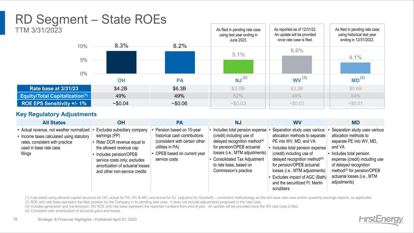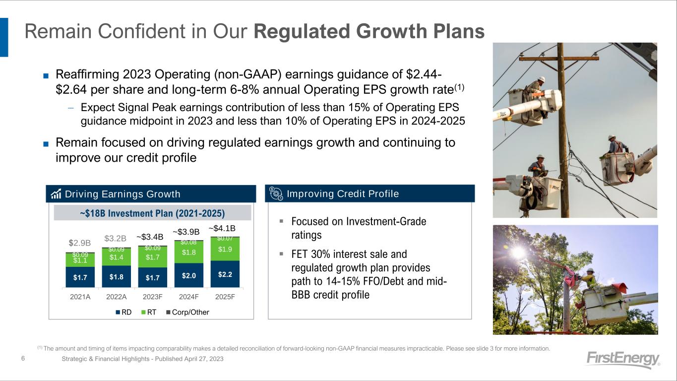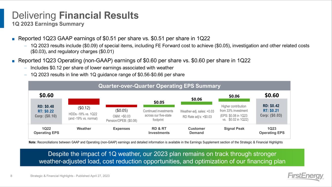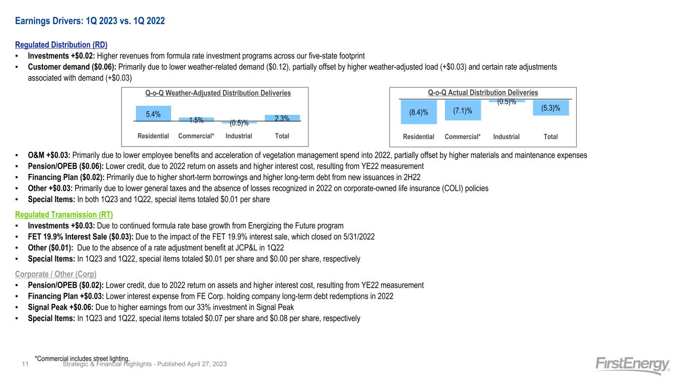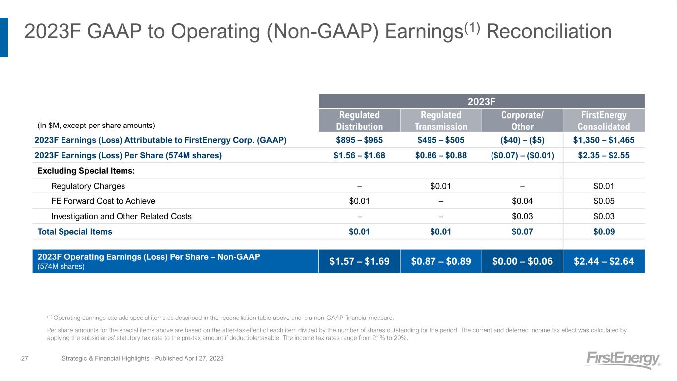 1Q 2023 (in millions, except for per share amounts) GAAP Special Items Operating (Non-GAAP) RD RT Corp FE RD RT Corp FE RD RT Corp FE (1) Electric sales $ 2,772 $ 460 $ (43) $ 3,189 $ — $ 7 (a) $ — $ 7 $ 2,772 $ 467 $ (43) $ 3,196 (2) Other 54 1 (13) 42 — — — — 54 1 (13) 42 (3) Total Revenues 2,826 461 (56) 3,231 — 7 — 7 2,826 468 (56) 3,238 (4) Fuel 133 — — 133 — — — — 133 — — 133 (5) Purchased power 1,120 — 4 1,124 — — — — 1,120 — 4 1,124 (6) Other operating expenses 786 89 (29) 846 (6) (b) (2) (a) (47) (b)-(d) (55) 780 87 (76) 791 (7) Provision for depreciation 251 91 19 361 (1) (b) — — (1) 250 91 19 360 (8) Deferral of regulatory assets, net (79) (1) — (80) — — — — (79) (1) — (80) (9) General taxes 219 65 12 296 — — — — 219 65 12 296 (10) Total Operating Expenses 2,430 244 6 2,680 (7) (2) (47) (56) 2,423 242 (41) 2,624 (11) Equity method investment earnings — — 56 56 — — — — — — 56 56 (12) Miscellaneous income (expense), net 34 2 (1) 35 — — — — 34 2 (1) 35 (13) Interest expense (146) (59) (58) (263) — — — — (146) (59) (58) (263) (14) Capitalized financing costs 8 12 1 21 — — — — 8 12 1 21 (15) Total Other Expense (104) (45) (2) (151) — — — — (104) (45) (2) (151) (16) Income taxes (benefits) 56 40 (6) 90 2 (b) 2 (a) 9 (b)-(e) 13 58 42 3 103 (17) Income attributable to noncontrolling interest — 18 — 18 — — — — — 18 — 18 (18) Earnings (Loss) Attributable to FirstEnergy Corp. $ 236 $ 114 $ (58) $ 292 $ 5 $ 7 $ 38 $ 50 $ 241 $ 121 $ (20) $ 342 (19) Average Shares Outstanding 572 572 572 (20) Earnings (Loss) per Share $ 0.41 $ 0.20 $ (0.10) $ 0.51 $ 0.01 $ 0.01 $ 0.07 $ 0.09 $ 0.42 $ 0.21 $ (0.03) $ 0.60 Special Items (after-tax impact): (a) Regulatory charges $ — $ 7 $ — $ 7 (b) FE Forward cost to achieve 5 — 23 28 (c) Investigation and other related costs — — 13 13 (d) Exit of generation — — 1 1 (e) State tax legislative changes — — 1 1 Impact to Earnings $ 5 $ 7 $ 38 $ 50 Strategic & Financial Highlights - Published April 27, 202313