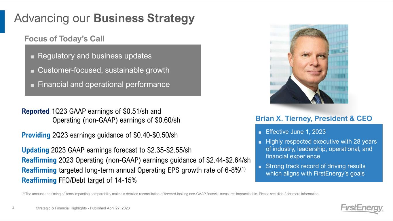 Non-GAAP Financial Matters 3 This presentation contains references to non-GAAP financial measures including, among others, Operating earnings (loss), Operating earnings (loss) per share (“EPS”), and Operating EPS by segment, and presents the impact of special items on the following measures, Total revenues, Total operating expenses, Total other expense, and Earnings (loss) attributable to FirstEnergy Corp. Generally, a non- GAAP financial measure is a numerical measure of a company’s historical or future financial performance, financial position, or cash flows that either excludes or includes amounts that are not normally excluded or included in the most directly comparable measure calculated and presented in accordance with accounting principles generally accepted in the United States (“GAAP”). Certain financial measures, including Operating earnings (loss), Operating EPS, and Operating EPS by segment are not calculated in accordance with GAAP to the extent they exclude the impact of “special items.” Special items represent charges incurred or benefits realized that management believes are not indicative of, or may obscure trends useful in evaluating the Company’s ongoing core activities and results of operations or otherwise warrant separate classification. Special items are not necessarily non-recurring. Management cannot estimate on a forward-looking basis the impact of these items in the context of long-term annual operating EPS growth rate projections because these items, which could be significant, are difficult to predict and may be highly variable. Consequently, the Company is unable to reconcile long-term annual operating EPS growth projections to a GAAP measure without unreasonable effort. Basic (GAAP) EPS and Operating EPS and Basic (GAAP) EPS and Operating EPS for each segment are calculated by dividing Operating earnings (loss), which excludes special items as discussed above, for the periods presented by 570 million shares for the first quarter 2022, 571 million shares for the full year 2022, 572 million share for the first quarter 2023, 573 million shares for the second quarter 2023, and 574 million shares for the full year 2023. Management uses non-GAAP financial measures such as Operating earnings (loss), and Operating EPS to evaluate the Company’s performance and manage its operations and frequently references these non-GAAP financial measures in its decision-making, using them to facilitate historical and ongoing performance comparisons. Additionally, management uses Operating EPS by segment to further evaluate the Company’s performance by segment and references this non-GAAP financial measure in its decision-making. Management believes that the non-GAAP financial measures of Operating earnings (loss), Operating EPS, and Operating EPS by segment, provide consistent and comparable measures of performance of its businesses on an ongoing basis. Management also believes that such measures are useful to shareholders and other interested parties to understand performance trends and evaluate the Company against its peer group by presenting period-over-period operating results without the effect of certain charges or benefits that may not be consistent or comparable across periods or across the Company’s peer group. All of these non-GAAP financial measures are intended to complement, and are not considered as alternatives to, the most directly comparable GAAP financial measures. Also, the non-GAAP financial measures may not be comparable to similarly titled measures used by other entities. Pursuant to the requirements of Regulation G, FE has provided, where possible without unreasonable effort, quantitative reconciliations within this presentation of the non-GAAP financial measures to the most directly comparable GAAP financial measures. Strategic & Financial Highlights - Published April 27, 2023