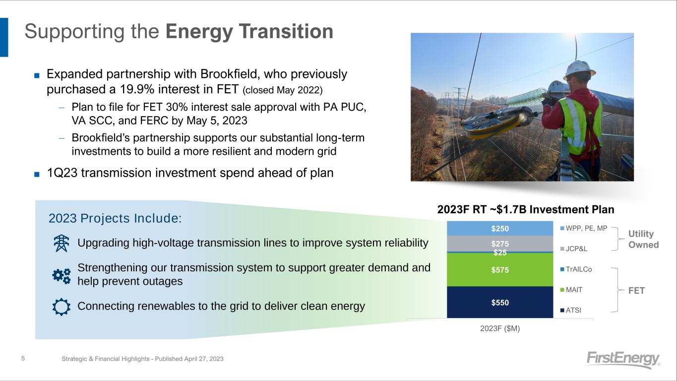 Strategic & Financial Highlights - Published April 27, 20234 Reported 1Q23 GAAP earnings of $0.51/sh and Operating (non-GAAP) earnings of $0.60/sh Providing 2Q23 earnings guidance of $0.40-$0.50/sh Updating 2023 GAAP earnings forecast to $2.35-$2.55/sh Reaffirming 2023 Operating (non-GAAP) earnings guidance of $2.44-$2.64/sh Reaffirming targeted long-term annual Operating EPS growth rate of 6-8%(1) Reaffirming FFO/Debt target of 14-15% ■ Effective June 1, 2023 ■ Highly respected executive with 28 years of industry, leadership, operational, and financial experience ■ Strong track record of driving results which aligns with FirstEnergy’s goals Brian X. Tierney, President & CEO (1) The amount and timing of items impacting comparability makes a detailed reconciliation of forward-looking non-GAAP financial measures impracticable. Please see slide 3 for more information. ■ Regulatory and business updates ■ Customer-focused, sustainable growth ■ Financial and operational performance Focus of Today’s Call Advancing our Business Strategy