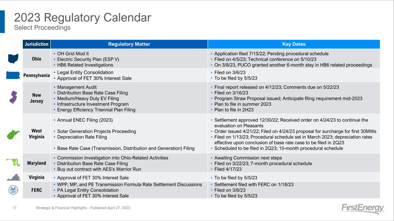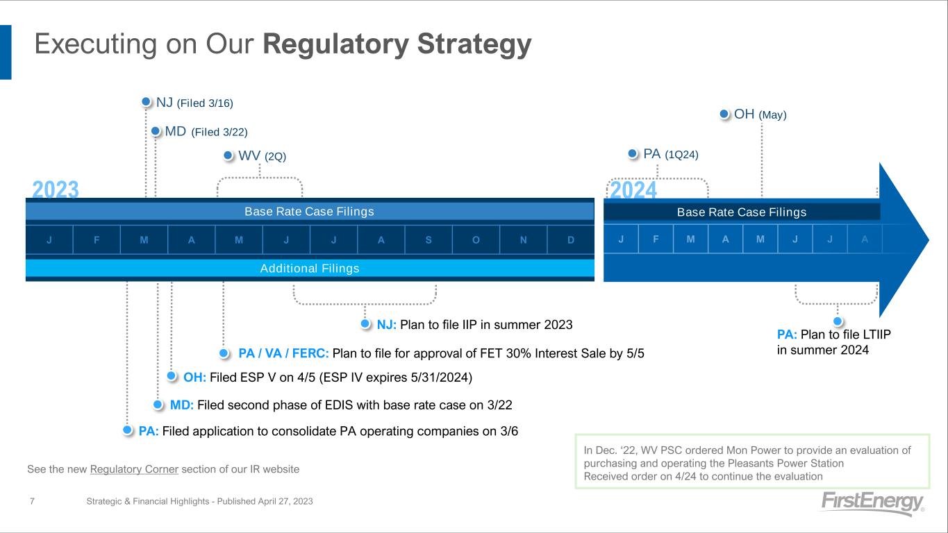 Jurisdiction Regulatory Matter Key Dates Ohio • OH Grid Mod II • Electric Security Plan (ESP V) • HB6 Related Investigations • Application filed 7/15/22; Pending procedural schedule • Filed on 4/5/23; Technical conference on 5/10/23 • On 3/8/23, PUCO granted another 6-month stay in HB6 related proceedings Pennsylvania • Legal Entity Consolidation • Approval of FET 30% Interest Sale • Filed on 3/6/23 • To be filed by 5/5/23 New Jersey • Management Audit • Distribution Base Rate Case Filing • Medium/Heavy Duty EV Filing • Infrastructure Investment Program • Energy Efficiency Triennial Plan Filing • Final report released on 4/12/23; Comments due on 5/22/23 • Filed on 3/16/23 • Program Straw Proposal issued; Anticipate filing requirement mid-2023 • Plan to file in summer 2023 • Plan to file in 2H23 West Virginia • Annual ENEC Filing (2023) • Solar Generation Projects Proceeding • Depreciation Rate Filing • Base Rate Case (Transmission, Distribution and Generation) Filing • Settlement approved 12/30/22; Received order on 4/24/23 to continue the evaluation on Pleasants • Order issued 4/21/22; Filed on 4/24/23 proposal for surcharge for first 30MWs • Filed on 1/13/23; Procedural schedule set in March 2023; depreciation rates effective upon conclusion of base rate case to be filed in 2Q23 • Scheduled to be filed in 2Q23; 10-month procedural schedule Maryland • Commission Investigation into Ohio-Related Activities • Distribution Base Rate Case Filing • Buy out contract with AES's Warrior Run • Awaiting Commission next steps • Filed on 3/22/23; 7-month procedural schedule • Filed 4/17/23 Virginia • Approval of FET 30% Interest Sale • To be filed by 5/5/23 FERC • WPP, MP, and PE Transmission Formula Rate Settlement Discussions • PA Legal Entity Consolidation • Approval of FET 30% Interest Sale • Settlement filed with FERC on 1/18/23 • Filed on 3/6/23 • To be filed by 5/5/23 2023 Regulatory Calendar Select Proceedings Strategic & Financial Highlights - Published April 27, 202317