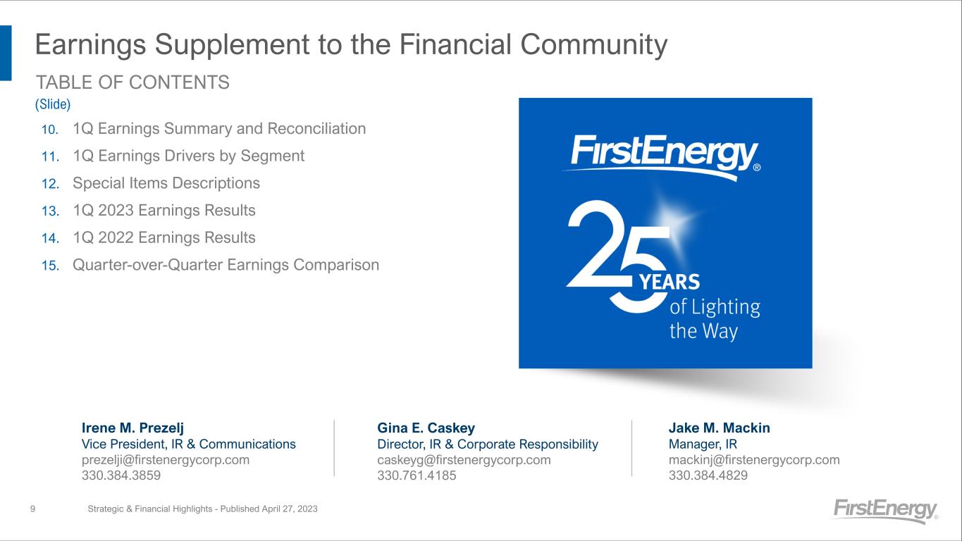 Earnings Supplement to the Financial Community Strategic & Financial Highlights - Published April 27, 2023 10. 1Q Earnings Summary and Reconciliation 11. 1Q Earnings Drivers by Segment 12. Special Items Descriptions 13. 1Q 2023 Earnings Results 14. 1Q 2022 Earnings Results 15. Quarter-over-Quarter Earnings Comparison TABLE OF CONTENTS (Slide) Irene M. Prezelj Vice President, IR & Communications prezelji@firstenergycorp.com 330.384.3859 Gina E. Caskey Director, IR & Corporate Responsibility caskeyg@firstenergycorp.com 330.761.4185 Jake M. Mackin Manager, IR mackinj@firstenergycorp.com 330.384.4829 9