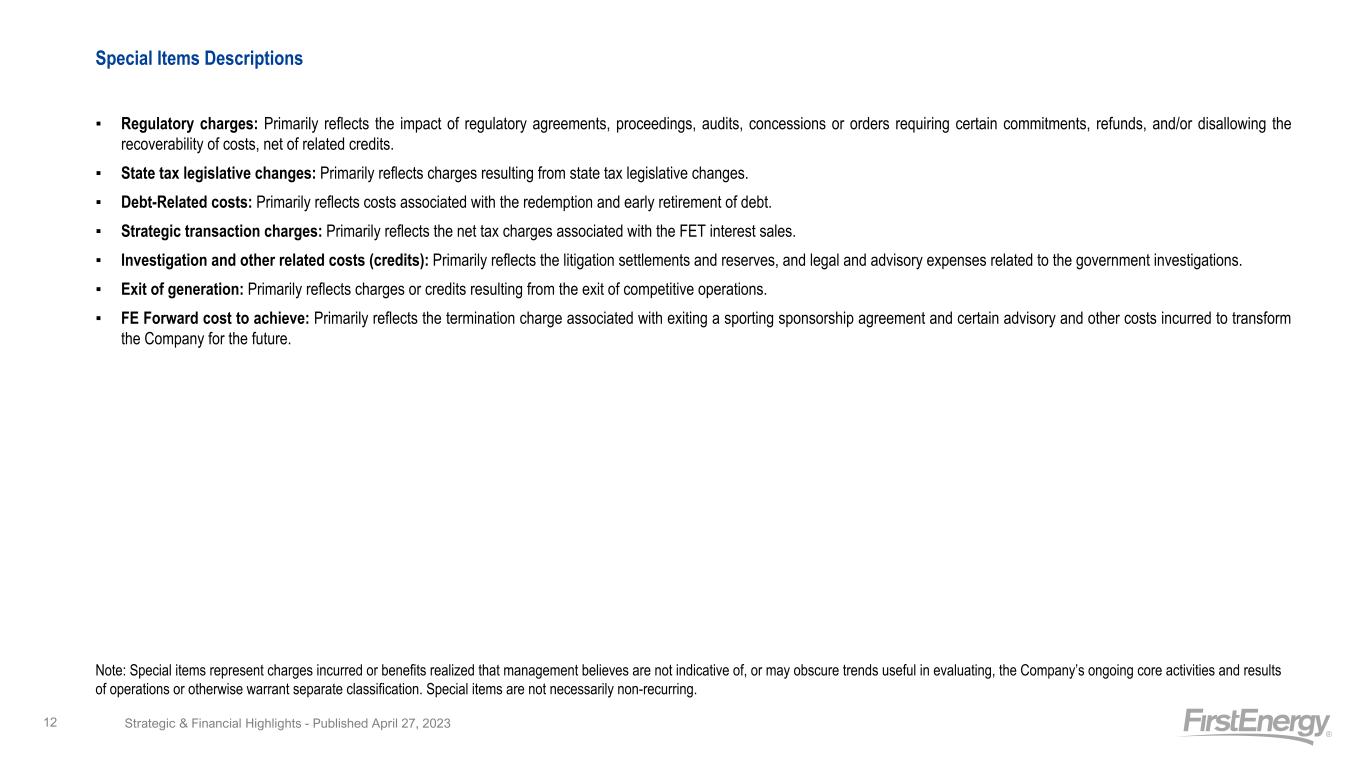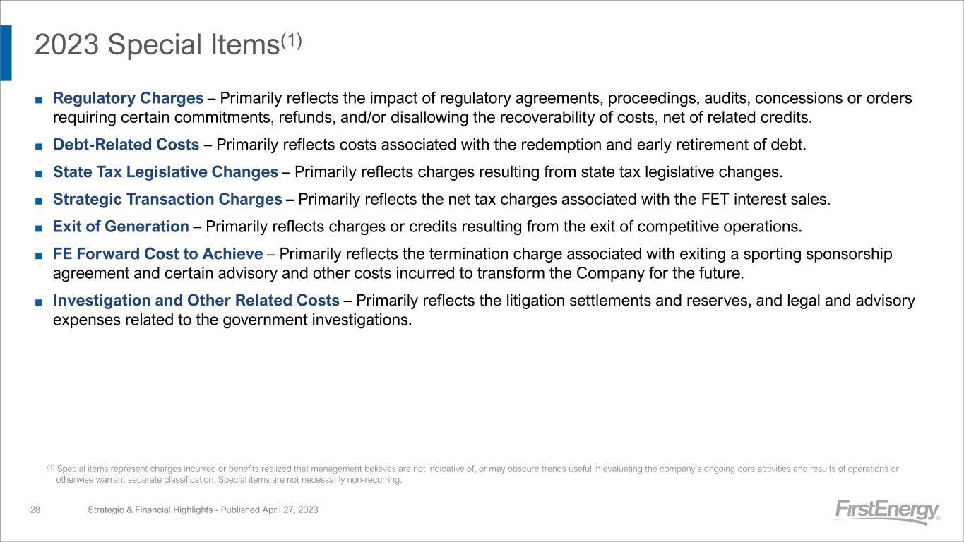 Special Items Descriptions ▪ Regulatory charges: Primarily reflects the impact of regulatory agreements, proceedings, audits, concessions or orders requiring certain commitments, refunds, and/or disallowing the recoverability of costs, net of related credits. ▪ State tax legislative changes: Primarily reflects charges resulting from state tax legislative changes. ▪ Debt-Related costs: Primarily reflects costs associated with the redemption and early retirement of debt. ▪ Strategic transaction charges: Primarily reflects the net tax charges associated with the FET interest sales. ▪ Investigation and other related costs (credits): Primarily reflects the litigation settlements and reserves, and legal and advisory expenses related to the government investigations. ▪ Exit of generation: Primarily reflects charges or credits resulting from the exit of competitive operations. ▪ FE Forward cost to achieve: Primarily reflects the termination charge associated with exiting a sporting sponsorship agreement and certain advisory and other costs incurred to transform the Company for the future. Note: Special items represent charges incurred or benefits realized that management believes are not indicative of, or may obscure trends useful in evaluating, the Company’s ongoing core activities and results of operations or otherwise warrant separate classification. Special items are not necessarily non-recurring. Strategic & Financial Highlights - Published April 27, 202312