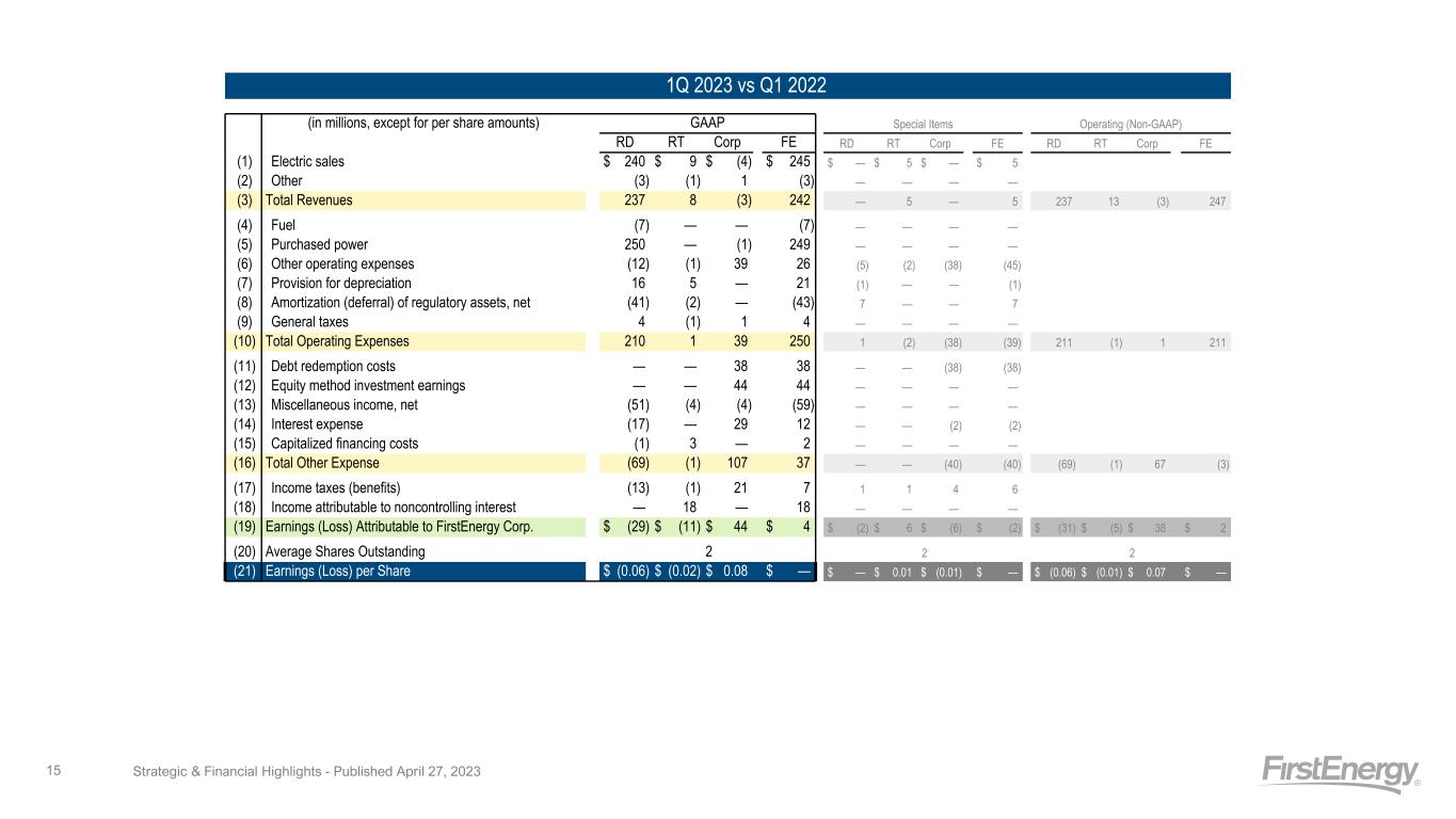1Q 2023 vs Q1 2022 (in millions, except for per share amounts) GAAP Special Items Operating (Non-GAAP) RD RT Corp FE RD RT Corp FE RD RT Corp FE (1) Electric sales $ 240 $ 9 $ (4) $ 245 $ — $ 5 $ — $ 5 $ 240 $ 14 $ (4) $ 250 (2) Other (3) (1) 1 (3) — — — — (3) (1) 1 (3) (3) Total Revenues 237 8 (3) 242 — 5 — 5 237 13 (3) 247 (4) Fuel (7) — — (7) — — — — (7) — — (7) (5) Purchased power 250 — (1) 249 — — — — 250 — (1) 249 (6) Other operating expenses (12) (1) 39 26 (5) (2) (38) (45) (17) (3) 1 (19) (7) Provision for depreciation 16 5 — 21 (1) — — (1) 15 5 — 20 (8) Amortization (deferral) of regulatory assets, net (41) (2) — (43) 7 — — 7 (34) (2) — (36) (9) General taxes 4 (1) 1 4 — — — — 4 (1) 1 4 (10) Total Operating Expenses 210 1 39 250 1 (2) (38) (39) 211 (1) 1 211 (11) Debt redemption costs — — 38 38 — — (38) (38) — — — — (12) Equity method investment earnings — — 44 44 — — — — — — 44 44 (13) Miscellaneous income, net (51) (4) (4) (59) — — — — (51) (4) (4) (59) (14) Interest expense (17) — 29 12 — — (2) (2) (17) — 27 10 (15) Capitalized financing costs (1) 3 — 2 — — — — (1) 3 — 2 (16) Total Other Expense (69) (1) 107 37 — — (40) (40) (69) (1) 67 (3) (17) Income taxes (benefits) (13) (1) 21 7 1 1 4 6 (12) — 25 13 (18) Income attributable to noncontrolling interest — 18 — 18 — — — — — 18 — 18 (19) Earnings (Loss) Attributable to FirstEnergy Corp. $ (29) $ (11) $ 44 $ 4 $ (2) $ 6 $ (6) $ (2) $ (31) $ (5) $ 38 $ 2 (20) Average Shares Outstanding 2 2 2 (21) Earnings (Loss) per Share $ (0.06) $ (0.02) $ 0.08 $ — $ — $ 0.01 $ (0.01) $ — $ (0.06) $ (0.01) $ 0.07 $ — Strategic & Financial Highlights - Published April 27, 202315