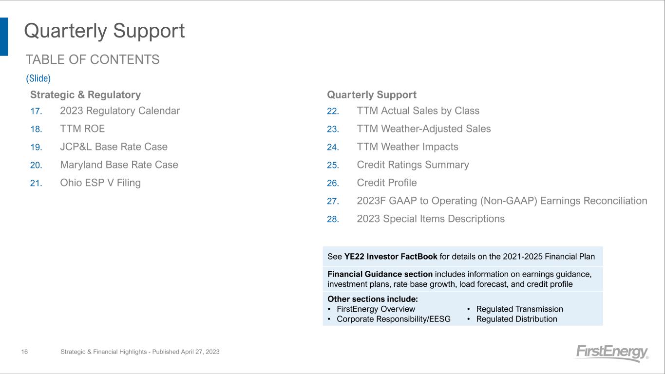 Quarterly Support Strategic & Financial Highlights - Published April 27, 2023 Strategic & Regulatory 17. 2023 Regulatory Calendar 18. TTM ROE 19. JCP&L Base Rate Case 20. Maryland Base Rate Case 21. Ohio ESP V Filing TABLE OF CONTENTS (Slide) 16 Quarterly Support 22. TTM Actual Sales by Class 23. TTM Weather-Adjusted Sales 24. TTM Weather Impacts 25. Credit Ratings Summary 26. Credit Profile 27. 2023F GAAP to Operating (Non-GAAP) Earnings Reconciliation 28. 2023 Special Items Descriptions See YE22 Investor FactBook for details on the 2021-2025 Financial Plan Financial Guidance section includes information on earnings guidance, investment plans, rate base growth, load forecast, and credit profile Other sections include: • FirstEnergy Overview • Corporate Responsibility/EESG • Regulated Transmission • Regulated Distribution