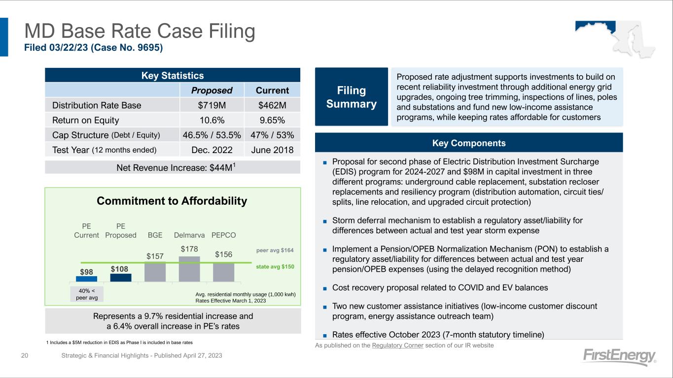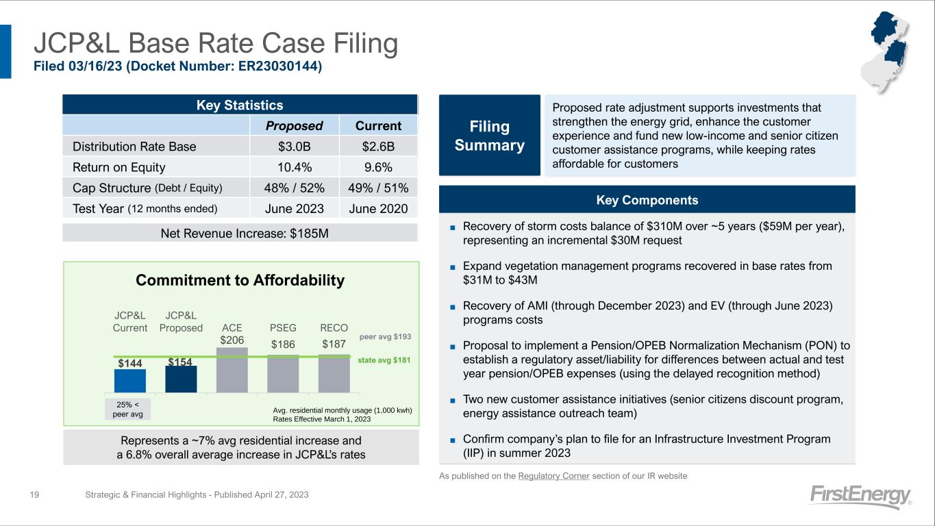 JCP&L Base Rate Case Filing Filed 03/16/23 (Docket Number: ER23030144) Key Statistics Proposed Current Distribution Rate Base $3.0B $2.6B Return on Equity 10.4% 9.6% Cap Structure (Debt / Equity) 48% / 52% 49% / 51% Test Year (12 months ended) June 2023 June 2020 Net Revenue Increase: $185M $144 $154 $206 $186 $187 JCP&L Current JCP&L Proposed ACE PSEG RECO Commitment to Affordability 25% < peer avg Key Components ■ Recovery of storm costs balance of $310M over ~5 years ($59M per year), representing an incremental $30M request ■ Expand vegetation management programs recovered in base rates from $31M to $43M ■ Recovery of AMI (through December 2023) and EV (through June 2023) programs costs ■ Proposal to implement a Pension/OPEB Normalization Mechanism (PON) to establish a regulatory asset/liability for differences between actual and test year pension/OPEB expenses (using the delayed recognition method) ■ Two new customer assistance initiatives (senior citizens discount program, energy assistance outreach team) ■ Confirm company’s plan to file for an Infrastructure Investment Program (IIP) in summer 2023 Filing Summary Proposed rate adjustment supports investments that strengthen the energy grid, enhance the customer experience and fund new low-income and senior citizen customer assistance programs, while keeping rates affordable for customers Avg. residential monthly usage (1,000 kwh) Rates Effective March 1, 2023 state avg $181 peer avg $193 Represents a ~7% avg residential increase and a 6.8% overall average increase in JCP&L’s rates As published on the Regulatory Corner section of our IR website i i i t i ti t . . t it . . t t ( t / it ) / / t ( t ) t I : Strategic & Financial Highlights - Published April 27, 202319