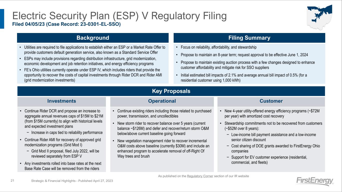 Electric Security Plan (ESP) V Regulatory Filing Filed 04/05/23 (Case Record: 23-0301-EL-SSO) Strategic & Financial Highlights - Published April 27, 202321 As published on the Regulatory Corner section of our IR website Background • Utilities are required to file applications to establish either an ESP or a Market Rate Offer to provide customers default generation service, also known as a Standard Service Offer • ESPs may include provisions regarding distribution infrastructure, grid modernization, economic development and job retention initiatives, and energy efficiency programs • FE’s Ohio utilities currently operate under ESP IV, which includes riders that provide the opportunity to recover the costs of capital investments through Rider DCR and Rider AMI (grid modernization investments) Filing Summary • Focus on reliability, affordability, and stewardship • Propose to maintain an 8-year term; request approval to be effective June 1, 2024 • Propose to maintain existing auction process with a few changes designed to enhance customer affordability and mitigate risk for SSO suppliers • Initial estimated bill impacts of 2.1% and average annual bill impact of 0.5% (for a residential customer using 1,000 kWh) Key Proposals Investments Operational Customer • Continue Rider DCR and propose an increase to aggregate annual revenues caps of $15M to $21M (from $15M currently) to align with historical levels and expected investment plans − Increase in caps tied to reliability performance • Continue Rider AMI for recovery of approved grid modernization programs (Grid Mod I) − Grid Mod II proposal, filed July 2022, will be reviewed separately from ESP V • Any investments rolled into base rates at the next Base Rate Case will be removed from the riders • Continue existing riders including those related to purchased power, transmission, and uncollectibles • New storm rider to recover balance over 5 years (current balance ~$126M) and defer and recover/return storm O&M below/above current baseline going forward • New vegetation management rider to recover incremental O&M costs above baseline (currently $30M) and include an enhanced program to accelerate removal of off-Right Of Way trees and brush • New 4-year utility-offered energy efficiency programs (~$72M per year) with amortized cost recovery • Stewardship commitments not to be recovered from customers (~$52M over 8 years): − Low-income bill payment assistance and a low-income senior citizen discount − Cost sharing of DOE grants awarded to FirstEnergy Ohio companies − Support for EV customer experience (residential, commercial, and fleets)