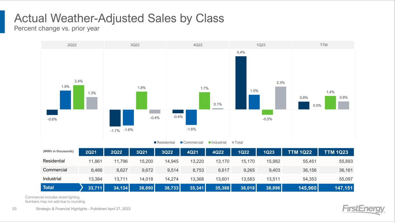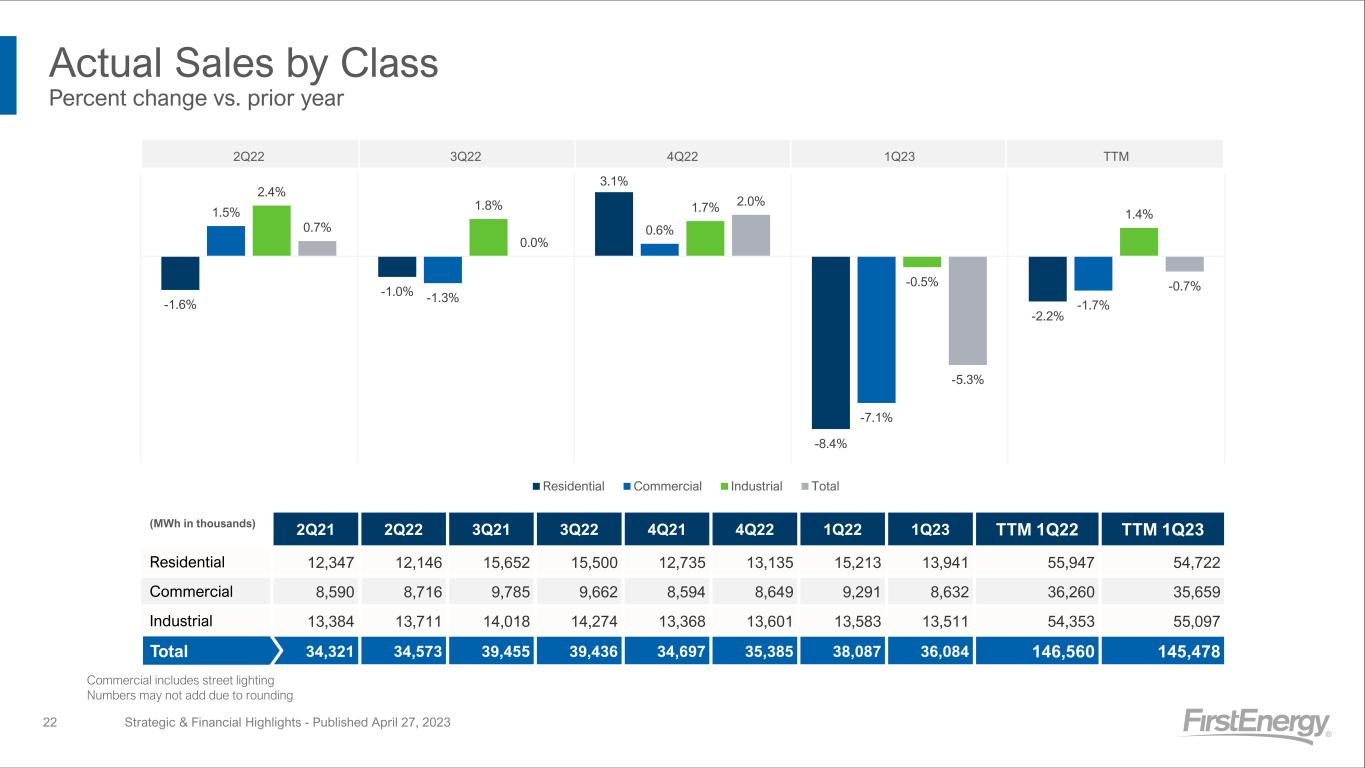 (MWh in thousands) 2Q21 2Q22 3Q21 3Q22 4Q21 4Q22 1Q22 1Q23 TTM 1Q22 TTM 1Q23 Residential 12,347 12,146 15,652 15,500 12,735 13,135 15,213 13,941 55,947 54,722 Commercial 8,590 8,716 9,785 9,662 8,594 8,649 9,291 8,632 36,260 35,659 Industrial 13,384 13,711 14,018 14,274 13,368 13,601 13,583 13,511 54,353 55,097 Total 34,321 34,573 39,455 39,436 34,697 35,385 38,087 36,084 146,560 145,478 Actual Sales by Class Percent change vs. prior year -1.6% -1.0% 3.1% -8.4% -2.2% 1.5% -1.3% 0.6% -7.1% -1.7% 2.4% 1.8% 1.7% -0.5% 1.4% 0.7% 0.0% 2.0% -5.3% -0.7% 2Q22 3Q22 4Q22 1Q23 TTM Residential Commercial Industrial Total Commercial includes street lighting Numbers may not add due to rounding Strategic & Financial Highlights - Published April 27, 202322