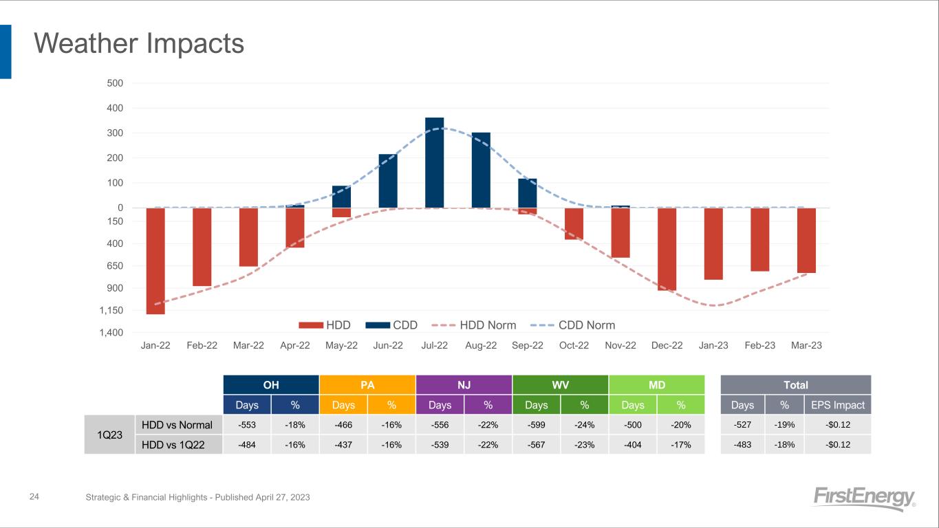 Weather Impacts Strategic & Financial Highlights - Published April 27, 2023 0 100 200 300 400 500 1,400 1,150 900 650 400 150 Jan-22 Feb-22 Mar-22 Apr-22 May-22 Jun-22 Jul-22 Aug-22 Sep-22 Oct-22 Nov-22 Dec-22 Jan-23 Feb-23 Mar-23 HDD CDD HDD Norm CDD Norm OH PA NJ WV MD Total Days % Days % Days % Days % Days % Days % EPS Impact 1Q23 HDD vs Normal -553 -18% -466 -16% -556 -22% -599 -24% -500 -20% -527 -19% -$0.12 HDD vs 1Q22 -484 -16% -437 -16% -539 -22% -567 -23% -404 -17% -483 -18% -$0.12 24