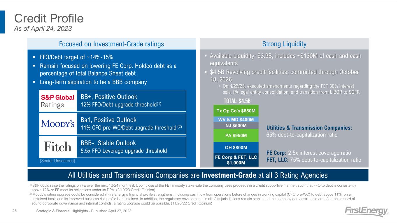 ■ On February 10, 2023, S&P changed the outlook of FE and most subsidiaries to Positive ■ On September 13, 2022, Moody’s issued one-notch downgrades for CEI and TE and changed their outlook to Stable ■ On July 22, 2022, Fitch issued one-notch upgrades on FE, FET, and all subsidiaries. • All companies are now investment grade with a Stable outlook Credit Ratings As of April 24, 2023 Strategic & Financial Highlights - Published April 27, 2023 Most recent ratings actions 25 S&P Moody's Fitch S&P Moody's Fitch S&P Moody's Fitch S&P Moody's Fitch FirstEnergy Corp. (*) BBB- Ba1 BBB- BB+ Ba1 BBB- P P S Allegheny Generating Co. BB+ Baa2 BBB P S S American Transmission Systems Inc. BBB A3 BBB BBB A3 BBB+ P S S Cleveland Electric Illuminating BBB Baa3 BBB A- Baa1 A- BBB Baa3 BBB+ P S S FirstEnergy Transmission (*) BBB- Baa2 BBB- BB+ Baa2 BBB- P S S Jersey Central Power & Light BBB A3 BBB BBB A3 BBB+ P S S Metropolitan Edison BBB A3 BBB BBB A3 BBB+ P S S Mid-Atlantic Interstate Transmission BBB A3 BBB BBB A3 BBB+ P S S Monongahela Power BBB Baa2 BBB A- A3 A- BBB Baa2 S S S Ohio Edison BBB A3 BBB A- A1 A- BBB A3 BBB+ P S S Pennsylvania Electric BBB Baa1 BBB BBB Baa1 BBB+ P S S Pennsylvania Power BBB A3 BBB A- A1 P S S Potomac Edison BBB Baa2 BBB A- A3 A- S S S Toledo Edison BBB Baa2 BBB A- A3 A- P S S Trans-Allegheny Interstate Line Co. BBB A3 BBB BBB A3 BBB+ P S S West Penn Power BBB A3 BBB A- A1 A- P S S S = Stable (*) = holding company P = Positive Shaded cells reflect non-investment grade ratings N = Negative Ratings are not recommendations to buy, sell, or hold securities. Ratings are subject to change or withdrawal at any time by the credit rating agencies. Issuer/Corporate Family Senior Secured Senior Unsecured Outlook/Watch
