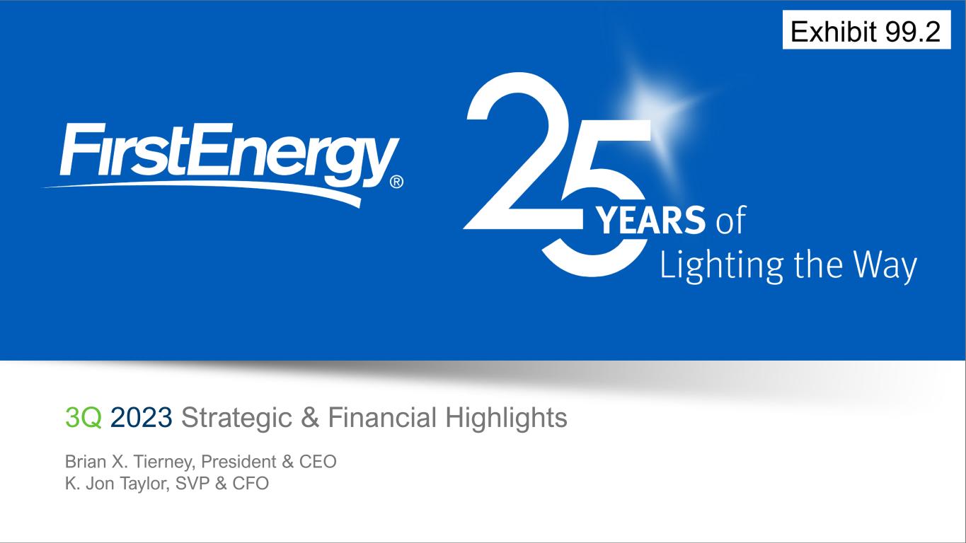Earnings Supplement to the Financial Community Strategic & Financial Highlights - Published October 26, 2023 12. 3Q Earnings Summary and Reconciliation 13. 3Q Earnings Drivers by Segment 14. YTD Earnings Summary and Reconciliation 15. YTD Earnings Drivers by Segment 16. Special Items Descriptions 17. 3Q 2023 Earnings Results 18. 3Q 2022 Earnings Results 19. Quarter-over-Quarter Earnings Comparison 20. YTD 2023 Earnings Results 21. YTD 2022 Earnings Results 22. Year-over-Year Earnings Comparison TABLE OF CONTENTS (Slide) Irene M. Prezelj Vice President, IR & Communications prezelji@firstenergycorp.com 330.384.3859 Gina E. Caskey Director, IR & Corporate Responsibility caskeyg@firstenergycorp.com 330.761.4185 Jake M. Mackin Manager, IR mackinj@firstenergycorp.com 330.384.4829 11
