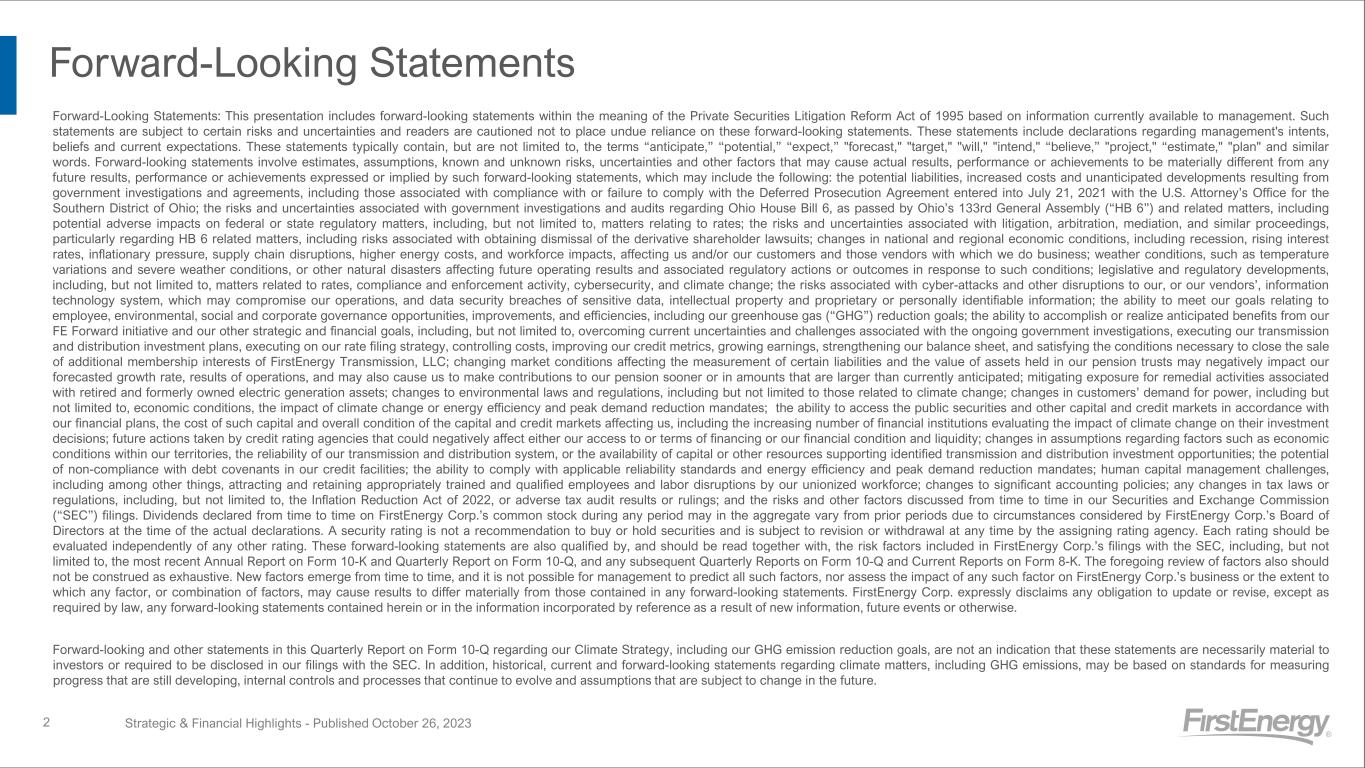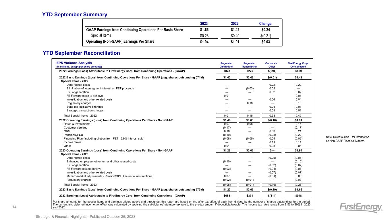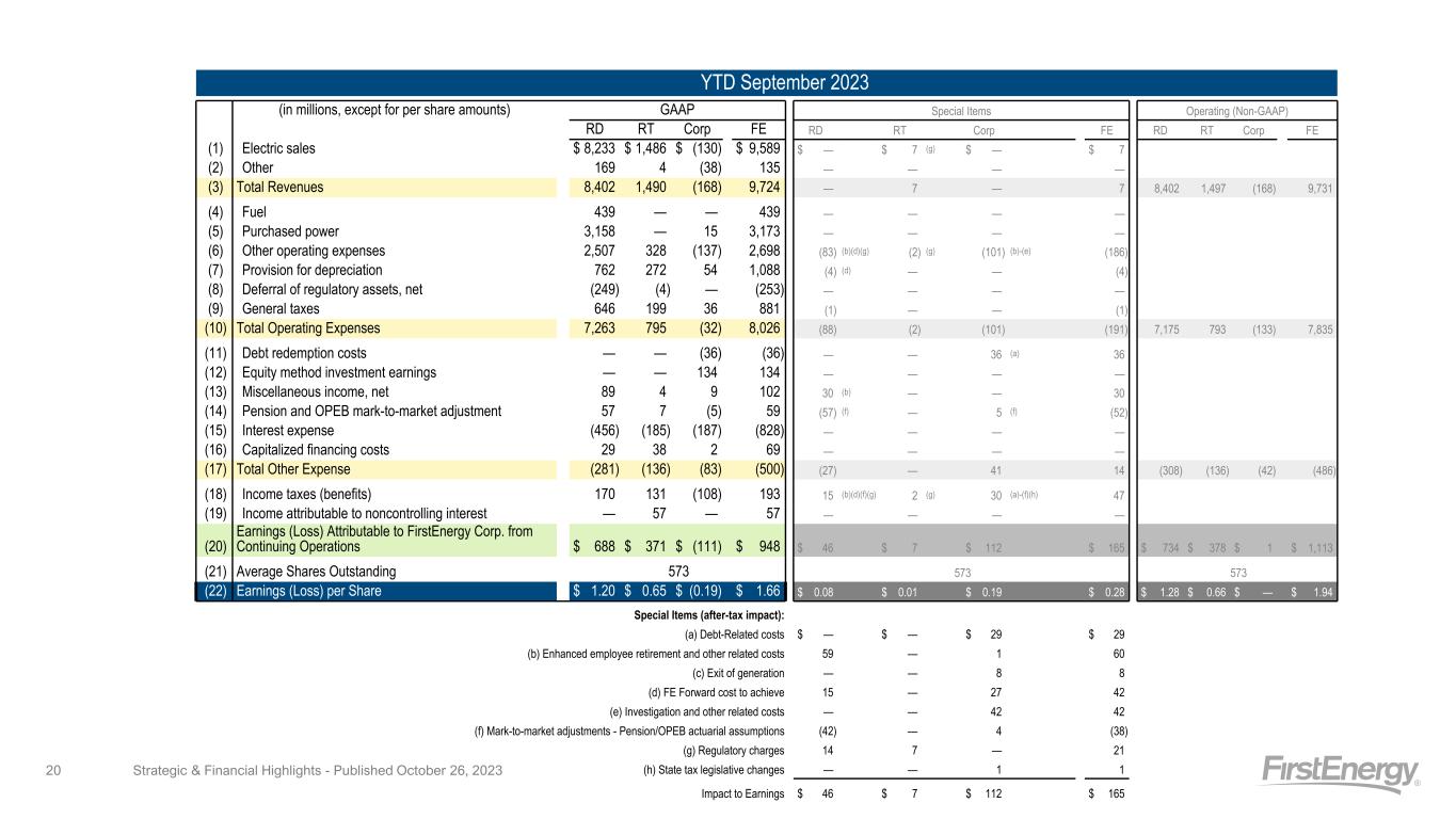YTD September 2023 (in millions, except for per share amounts) GAAP Special Items Operating (Non-GAAP) RD RT Corp FE RD RT Corp FE RD RT Corp FE (1) Electric sales $ 8,233 $ 1,486 $ (130) $ 9,589 $ — $ 7 (g) $ — $ 7 $ 8,233 $ 1,493 $ (130) $ 9,596 (2) Other 169 4 (38) 135 — — — — 169 4 (38) 135 (3) Total Revenues 8,402 1,490 (168) 9,724 — 7 — 7 8,402 1,497 (168) 9,731 (4) Fuel 439 — — 439 — — — — 439 — — 439 (5) Purchased power 3,158 — 15 3,173 — — — — 3,158 — 15 3,173 (6) Other operating expenses 2,507 328 (137) 2,698 (83) (b)(d)(g) (2) (g) (101) (b)-(e) (186) 2,424 326 (238) 2,512 (7) Provision for depreciation 762 272 54 1,088 (4) (d) — — (4) 758 272 54 1,084 (8) Deferral of regulatory assets, net (249) (4) — (253) — — — — (249) (4) — (253) (9) General taxes 646 199 36 881 (1) — — (1) 645 199 36 880 (10) Total Operating Expenses 7,263 795 (32) 8,026 (88) (2) (101) (191) 7,175 793 (133) 7,835 (11) Debt redemption costs — — (36) (36) — — 36 (a) 36 — — — — (12) Equity method investment earnings — — 134 134 — — — — — — 134 134 (13) Miscellaneous income, net 89 4 9 102 30 (b) — — 30 119 4 9 132 (14) Pension and OPEB mark-to-market adjustment 57 7 (5) 59 (57) (f) — 5 (f) (52) — 7 — 7 (15) Interest expense (456) (185) (187) (828) — — — — (456) (185) (187) (828) (16) Capitalized financing costs 29 38 2 69 — — — — 29 38 2 69 (17) Total Other Expense (281) (136) (83) (500) (27) — 41 14 (308) (136) (42) (486) (18) Income taxes (benefits) 170 131 (108) 193 15 (b)(d)(f)(g) 2 (g) 30 (a)-(f)(h) 47 185 133 (78) 240 (19) Income attributable to noncontrolling interest — 57 — 57 — — — — — 57 — 57 (20) Earnings (Loss) Attributable to FirstEnergy Corp. from Continuing Operations $ 688 $ 371 $ (111) $ 948 $ 46 $ 7 $ 112 $ 165 $ 734 $ 378 $ 1 $ 1,113 (21) Average Shares Outstanding 573 573 573 (22) Earnings (Loss) per Share $ 1.20 $ 0.65 $ (0.19) $ 1.66 $ 0.08 $ 0.01 $ 0.19 $ 0.28 $ 1.28 $ 0.66 $ — $ 1.94 Special Items (after-tax impact): (a) Debt-Related costs $ — $ — $ 29 $ 29 (b) Enhanced employee retirement and other related costs 59 — 1 60 (c) Exit of generation — — 8 8 (d) FE Forward cost to achieve 15 — 27 42 (e) Investigation and other related costs — — 42 42 (f) Mark-to-market adjustments - Pension/OPEB actuarial assumptions (42) — 4 (38) (g) Regulatory charges 14 7 — 21 (h) State tax legislative changes — — 1 1 Impact to Earnings $ 46 $ 7 $ 112 $ 165 Strategic & Financial Highlights - Published October 26, 202320