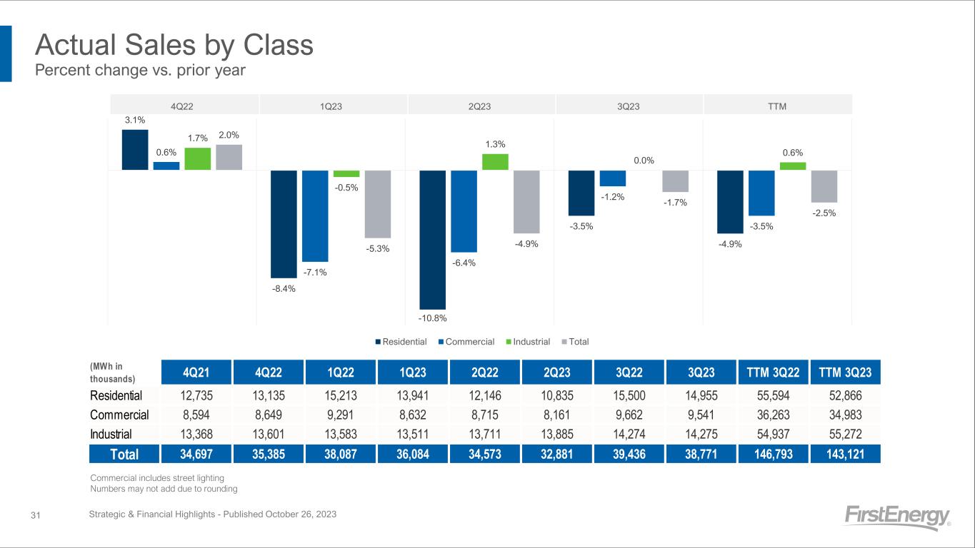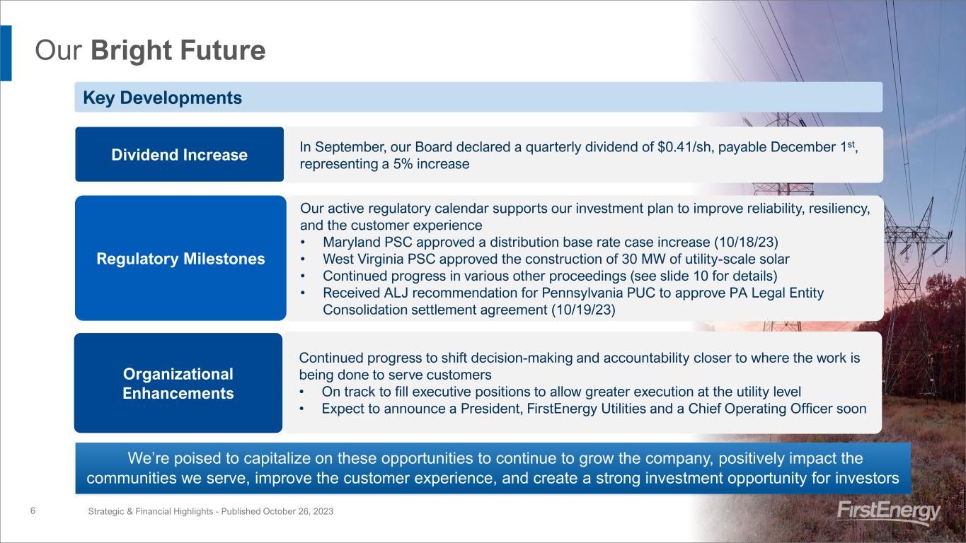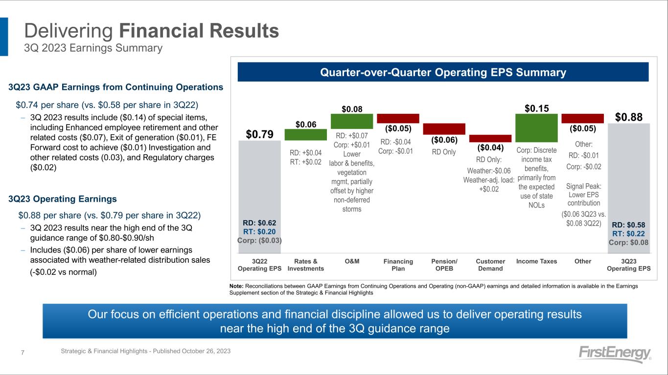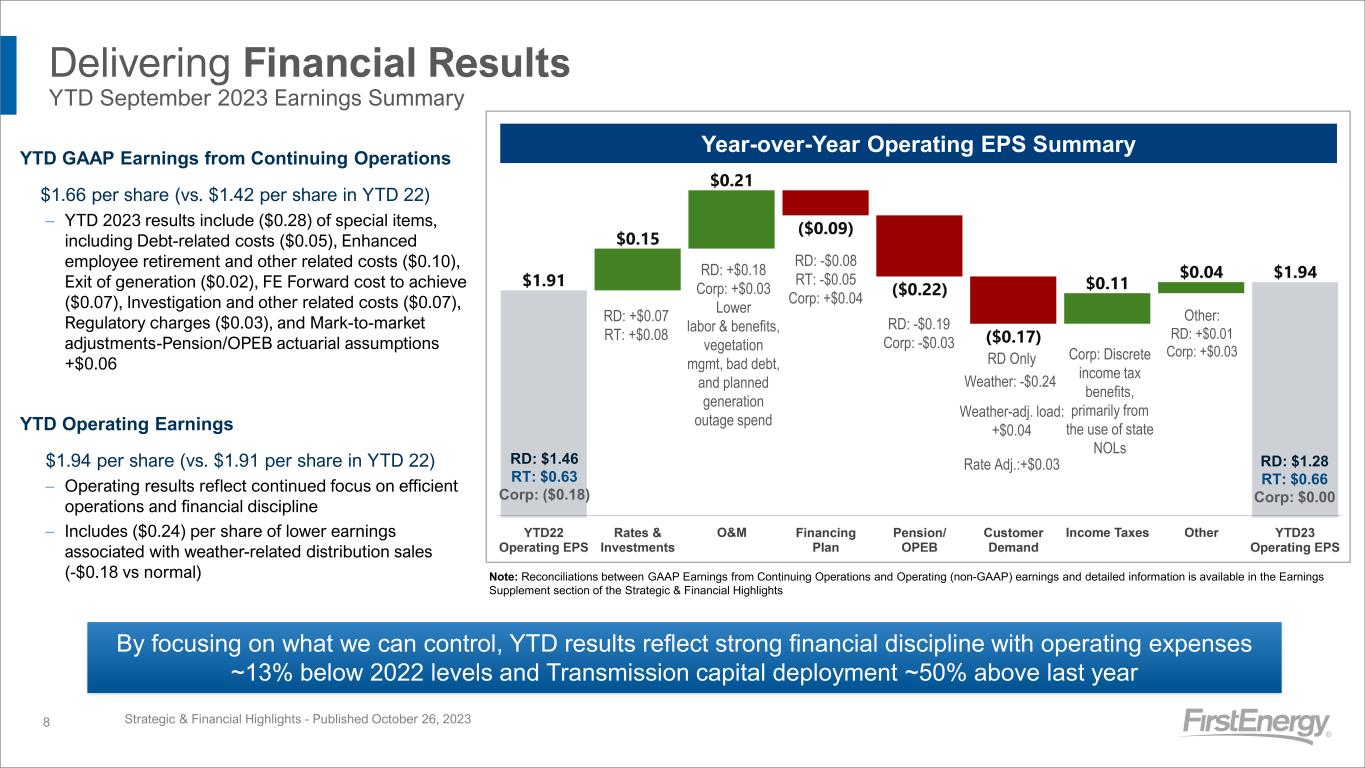 YTD September 2023 (in millions, except for per share amounts) GAAP Special Items Operating (Non-GAAP) RD RT Corp FE RD RT Corp FE RD RT Corp FE (1) Electric sales $ 8,233 $ 1,486 $ (130) $ 9,589 $ — $ 7 (g) $ — $ 7 $ 8,233 $ 1,493 $ (130) $ 9,596 (2) Other 169 4 (38) 135 — — — — 169 4 (38) 135 (3) Total Revenues 8,402 1,490 (168) 9,724 — 7 — 7 8,402 1,497 (168) 9,731 (4) Fuel 439 — — 439 — — — — 439 — — 439 (5) Purchased power 3,158 — 15 3,173 — — — — 3,158 — 15 3,173 (6) Other operating expenses 2,507 328 (137) 2,698 (83) (b)(d)(g) (2) (g) (101) (b)-(e) (186) 2,424 326 (238) 2,512 (7) Provision for depreciation 762 272 54 1,088 (4) (d) — — (4) 758 272 54 1,084 (8) Deferral of regulatory assets, net (249) (4) — (253) — — — — (249) (4) — (253) (9) General taxes 646 199 36 881 (1) — — (1) 645 199 36 880 (10) Total Operating Expenses 7,263 795 (32) 8,026 (88) (2) (101) (191) 7,175 793 (133) 7,835 (11) Debt redemption costs — — (36) (36) — — 36 (a) 36 — — — — (12) Equity method investment earnings — — 134 134 — — — — — — 134 134 (13) Miscellaneous income, net 89 4 9 102 30 (b) — — 30 119 4 9 132 (14) Pension and OPEB mark-to-market adjustment 57 7 (5) 59 (57) (f) — 5 (f) (52) — 7 — 7 (15) Interest expense (456) (185) (187) (828) — — — — (456) (185) (187) (828) (16) Capitalized financing costs 29 38 2 69 — — — — 29 38 2 69 (17) Total Other Expense (281) (136) (83) (500) (27) — 41 14 (308) (136) (42) (486) (18) Income taxes (benefits) 170 131 (108) 193 15 (b)(d)(f)(g) 2 (g) 30 (a)-(f)(h) 47 185 133 (78) 240 (19) Income attributable to noncontrolling interest — 57 — 57 — — — — — 57 — 57 (20) Earnings (Loss) Attributable to FirstEnergy Corp. from Continuing Operations $ 688 $ 371 $ (111) $ 948 $ 46 $ 7 $ 112 $ 165 $ 734 $ 378 $ 1 $ 1,113 (21) Average Shares Outstanding 573 573 573 (22) Earnings (Loss) per Share $ 1.20 $ 0.65 $ (0.19) $ 1.66 $ 0.08 $ 0.01 $ 0.19 $ 0.28 $ 1.28 $ 0.66 $ — $ 1.94 Special Items (after-tax impact): (a) Debt-Related costs $ — $ — $ 29 $ 29 (b) Enhanced employee retirement and other related costs 59 — 1 60 (c) Exit of generation — — 8 8 (d) FE Forward cost to achieve 15 — 27 42 (e) Investigation and other related costs — — 42 42 (f) Mark-to-market adjustments - Pension/OPEB actuarial assumptions (42) — 4 (38) (g) Regulatory charges 14 7 — 21 (h) State tax legislative changes — — 1 1 Impact to Earnings $ 46 $ 7 $ 112 $ 165 Strategic & Financial Highlights - Published October 26, 202320