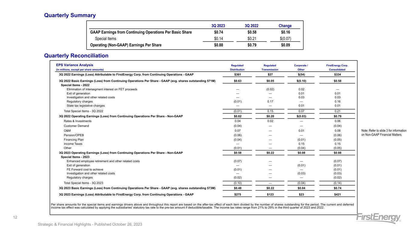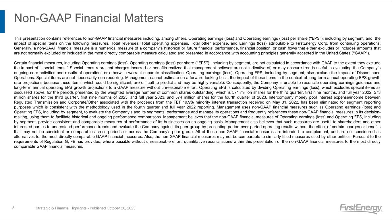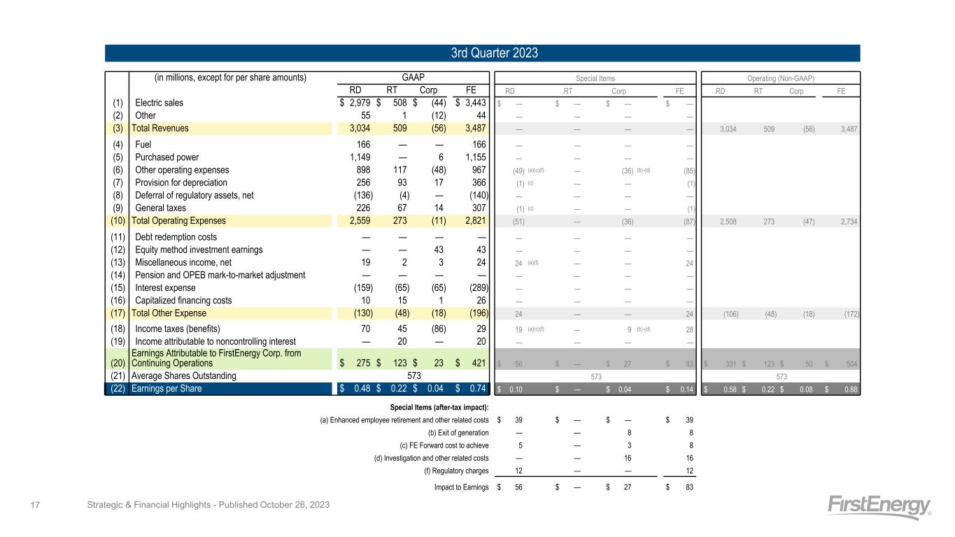 3rd Quarter 2023 (in millions, except for per share amounts) GAAP Special Items Operating (Non-GAAP) RD RT Corp FE RD RT Corp FE RD RT Corp FE (1) Electric sales $ 2,979 $ 508 $ (44) $ 3,443 $ — $ — $ — $ — $ 2,979 $ 508 $ (44) $ 3,443 (2) Other 55 1 (12) 44 — — — — 55 1 (12) 44 (3) Total Revenues 3,034 509 (56) 3,487 — — — — 3,034 509 (56) 3,487 (4) Fuel 166 — — 166 — — — — 166 — — 166 (5) Purchased power 1,149 — 6 1,155 — — — — 1,149 — 6 1,155 (6) Other operating expenses 898 117 (48) 967 (49) (a)(c)(f) — (36) (b)-(d) (85) 849 117 (84) 882 (7) Provision for depreciation 256 93 17 366 (1) (c) — — (1) 255 93 17 365 (8) Deferral of regulatory assets, net (136) (4) — (140) — — — — (136) (4) — (140) (9) General taxes 226 67 14 307 (1) (c) — — (1) 225 67 14 306 (10) Total Operating Expenses 2,559 273 (11) 2,821 (51) — (36) (87) 2,508 273 (47) 2,734 (11) Debt redemption costs — — — — — — — — — — — — (12) Equity method investment earnings — — 43 43 — — — — — — 43 43 (13) Miscellaneous income, net 19 2 3 24 24 (a)(f) — — 24 43 2 3 48 (14) Pension and OPEB mark-to-market adjustment — — — — — — — — — — — — (15) Interest expense (159) (65) (65) (289) — — — — (159) (65) (65) (289) (16) Capitalized financing costs 10 15 1 26 — — — — 10 15 1 26 (17) Total Other Expense (130) (48) (18) (196) 24 — — 24 (106) (48) (18) (172) (18) Income taxes (benefits) 70 45 (86) 29 19 (a)(c)(f) — 9 (b)-(d) 28 89 45 (77) 57 (19) Income attributable to noncontrolling interest — 20 — 20 — — — — — 20 — 20 (20) Earnings Attributable to FirstEnergy Corp. from Continuing Operations $ 275 $ 123 $ 23 $ 421 $ 56 $ — $ 27 $ 83 $ 331 $ 123 $ 50 $ 504 (21) Average Shares Outstanding 573 573 573 (22) Earnings per Share $ 0.48 $ 0.22 $ 0.04 $ 0.74 $ 0.10 $ — $ 0.04 $ 0.14 $ 0.58 $ 0.22 $ 0.08 $ 0.88 Special Items (after-tax impact): (a) Enhanced employee retirement and other related costs $ 39 $ — $ — $ 39 (b) Exit of generation — — 8 8 (c) FE Forward cost to achieve 5 — 3 8 (d) Investigation and other related costs — — 16 16 (f) Regulatory charges 12 — — 12 Impact to Earnings $ 56 $ — $ 27 $ 83 Strategic & Financial Highlights - Published October 26, 202317