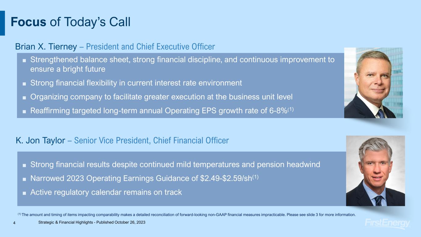Non-GAAP Financial Matters 3 This presentation contains references to non-GAAP financial measures including, among others, Operating earnings (loss) and Operating earnings (loss) per share (“EPS”), including by segment, and the impact of special items on the following measures, Total revenues, Total operating expenses, Total other expense, and Earnings (loss) attributable to FirstEnergy Corp. from continuing operations. Generally, a non-GAAP financial measure is a numerical measure of a company’s historical or future financial performance, financial position, or cash flows that either excludes or includes amounts that are not normally excluded or included in the most directly comparable measure calculated and presented in accordance with accounting principles generally accepted in the United States (“GAAP”). Certain financial measures, including Operating earnings (loss), Operating earnings (loss) per share (“EPS”), including by segment, are not calculated in accordance with GAAP to the extent they exclude the impact of “special items.” Special items represent charges incurred or benefits realized that management believes are not indicative of, or may obscure trends useful in evaluating the Company’s ongoing core activities and results of operations or otherwise warrant separate classification. Operating earnings (loss), Operating EPS, including by segment, also exclude the impact of Discontinued Operations. Special items are not necessarily non-recurring. Management cannot estimate on a forward-looking basis the impact of these items in the context of long-term annual operating EPS growth rate projections because these items, which could be significant, are difficult to predict and may be highly variable. Consequently, the Company is unable to reconcile operating earnings guidance and long-term annual operating EPS growth projections to a GAAP measure without unreasonable effort. Operating EPS is calculated by dividing Operating earnings (loss), which excludes special items as discussed above, for the periods presented by the weighted average number of common shares outstanding, which is 571 million shares for the third quarter, first nine months, and full year 2022, 573 million shares for the third quarter, first nine months of 2023, and full year 2023, and 574 million shares for the fourth quarter of 2023. Intercompany money pool interest expense/income between Regulated Transmission and Corporate/Other associated with the proceeds from the FET 19.9% minority interest transaction received on May 31, 2022, has been eliminated for segment reporting purposes which is consistent with the methodology used in the fourth quarter and full year 2022 reporting. Management uses non-GAAP financial measures such as Operating earnings (loss) and Operating EPS, including by segment, to evaluate the Company’s and its segments’ performance and manage its operations and frequently references these non-GAAP financial measures in its decision- making, using them to facilitate historical and ongoing performance comparisons. Management believes that the non-GAAP financial measures of Operating earnings (loss) and Operating EPS, including by segment, provide consistent and comparable measures of performance of its businesses on an ongoing basis. Management also believes that such measures are useful to shareholders and other interested parties to understand performance trends and evaluate the Company against its peer group by presenting period-over-period operating results without the effect of certain charges or benefits that may not be consistent or comparable across periods or across the Company’s peer group. All of these non-GAAP financial measures are intended to complement, and are not considered as alternatives to, the most directly comparable GAAP financial measures. Also, the non-GAAP financial measures may not be comparable to similarly titled measures used by other entities. Pursuant to the requirements of Regulation G, FE has provided, where possible without unreasonable effort, quantitative reconciliations within this presentation of the non-GAAP financial measures to the most directly comparable GAAP financial measures. Strategic & Financial Highlights - Published October 26, 2023