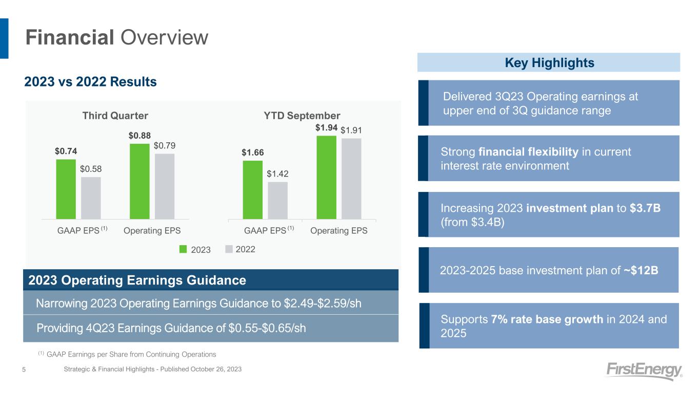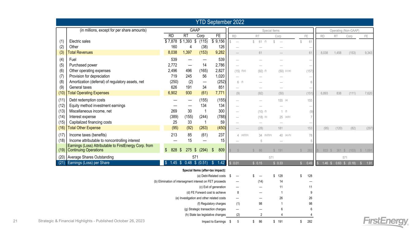 YTD September 2022 (in millions, except for per share amounts) GAAP Special Items Operating (Non-GAAP) RD RT Corp FE RD RT Corp FE RD RT Corp FE (1) Electric sales $ 7,878 $ 1,393 $ (115) $ 9,156 $ — $ 61 (f) $ — $ 61 $ 7,878 $ 1,454 $ (115) $ 9,217 (2) Other 160 4 (38) 126 — — — — 160 4 (38) 126 (3) Total Revenues 8,038 1,397 (153) 9,282 — 61 — 61 8,038 1,458 (153) 9,343 (4) Fuel 539 — — 539 — — — — 539 — — 539 (5) Purchased power 2,772 — 14 2,786 — — — — 2,772 — 14 2,786 (6) Other operating expenses 2,496 496 (165) 2,827 (15) (f)(d) (92) (f) (50) (c)-(e) (157) 2,481 404 (215) 2,670 (7) Provision for depreciation 719 245 56 1,020 — — — — 719 245 56 1,020 (8) Amortization (deferral) of regulatory assets, net (250) (2) — (252) 6 (f) — — 6 (244) (2) — (246) (9) General taxes 626 191 34 851 — — — — 626 191 34 851 (10) Total Operating Expenses 6,902 930 (61) 7,771 (9) (92) (50) (151) 6,893 838 (111) 7,620 (11) Debt redemption costs — — (155) (155) — — 155 (a) 155 — — — — (12) Equity method investment earnings — — 134 134 — — — — — — 134 134 (13) Miscellaneous income, net 269 30 1 300 — (10) (f) 1 (f) (9) 269 20 2 291 (14) Interest expense (389) (155) (244) (788) — (18) (b) 25 (a)(b) 7 (389) (173) (219) (781) (15) Capitalized financing costs 25 33 1 59 — — — — 25 33 1 59 (16) Total Other Expense (95) (92) (263) (450) — (28) 181 153 (95) (120) (82) (297) (17) Income taxes (benefits) 213 85 (61) 237 4 (d)(f)(h) 34 (b)(f)(h) 40 (a)-(h) 78 217 119 (21) 315 (18) Income attributable to noncontrolling interest — 15 — 15 — 5 — 5 — 20 — 20 (19) Earnings (Loss) Attributable to FirstEnergy Corp. from Continuing Operations $ 828 $ 275 $ (294) $ 809 $ 5 $ 86 $ 191 $ 282 $ 833 $ 361 $ (103) $ 1,091 (20) Average Shares Outstanding 571 571 571 (21) Earnings (Loss) per Share $ 1.45 $ 0.48 $ (0.51) $ 1.42 $ 0.01 $ 0.15 $ 0.33 $ 0.49 $ 1.46 $ 0.63 $ (0.18) $ 1.91 Special Items (after-tax impact): (a) Debt-Related costs $ — $ — $ 128 $ 128 (b) Elimination of intersegment interest on FET proceeds — (14) 14 — (c) Exit of generation — — 11 11 (d) FE Forward cost to achieve 8 — 1 9 (e) Investigation and other related costs — — 26 26 (f) Regulatory charges (1) 98 1 98 (g) Strategic transaction charges — — 6 6 (h) State tax legislative changes (2) 2 4 4 Impact to Earnings $ 5 $ 86 $ 191 $ 282 Strategic & Financial Highlights - Published October 26, 202321