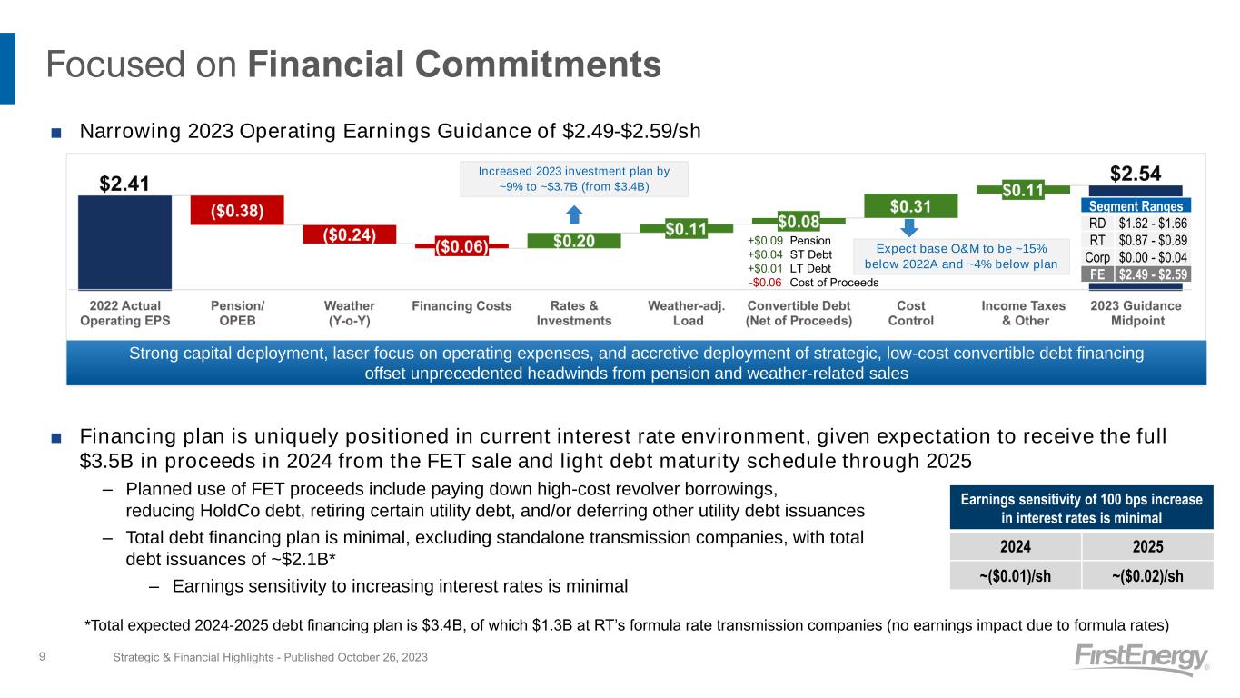 Delivering Financial Results YTD September 2023 Earnings Summary 8 YTD GAAP Earnings from Continuing Operations $1.66 per share (vs. $1.42 per share in YTD 22) – YTD 2023 results include ($0.28) of special items, including Debt-related costs ($0.05), Enhanced employee retirement and other related costs ($0.10), Exit of generation ($0.02), FE Forward cost to achieve ($0.07), Investigation and other related costs ($0.07), Regulatory charges ($0.03), and Mark-to-market adjustments-Pension/OPEB actuarial assumptions +$0.06 YTD Operating Earnings $1.94 per share (vs. $1.91 per share in YTD 22) – Operating results reflect continued focus on efficient operations and financial discipline – Includes ($0.24) per share of lower earnings associated with weather-related distribution sales (-$0.18 vs normal) Year-over-Year Operating EPS Summary Note: Reconciliations between GAAP Earnings from Continuing Operations and Operating (non-GAAP) earnings and detailed information is available in the Earnings Supplement section of the Strategic & Financial Highlights RD: $1.46 RT: $0.63 Corp: ($0.18) RD: $1.28 RT: $0.66 Corp: $0.00 RD Only Weather: -$0.24 Weather-adj. load: +$0.04 Rate Adj.:+$0.03 RD: +$0.07 RT: +$0.08 RD: +$0.18 Corp: +$0.03 Lower labor & benefits, vegetation mgmt, bad debt, and planned generation outage spend RD: -$0.19 Corp: -$0.03 RD: -$0.08 RT: -$0.05 Corp: +$0.04 Strategic & Financial Highlights - Published October 26, 2023 Other: RD: +$0.01 Corp: +$0.03Corp: Discrete income tax benefits, primarily from the use of state NOLs By focusing on what we can control, YTD results reflect strong financial discipline with operating expenses ~13% below 2022 levels and Transmission capital deployment ~50% above last year