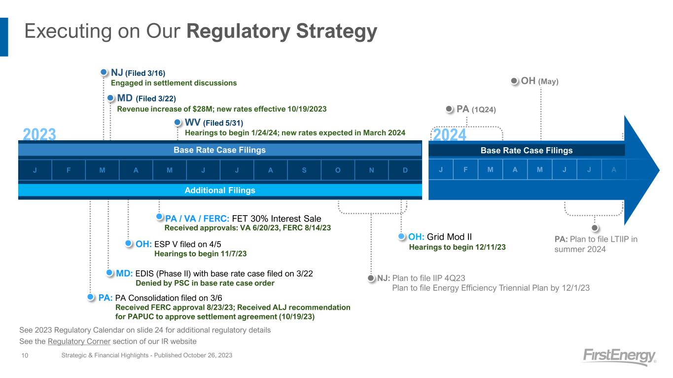 ■ Narrowing 2023 Operating Earnings Guidance of $2.49-$2.59/sh ■ Financing plan is uniquely positioned in current interest rate environment, given expectation to receive the full $3.5B in proceeds in 2024 from the FET sale and light debt maturity schedule through 2025 Strategic & Financial Highlights - Published October 26, 20239 Focused on Financial Commitments Increased 2023 investment plan by ~9% to ~$3.7B (from $3.4B) Expect base O&M to be ~15% below 2022A and ~4% below plan Segment Ranges RD $1.62 - $1.66 RT $0.87 - $0.89 Corp $0.00 - $0.04 FE $2.49 - $2.59 +$0.09 Pension +$0.04 ST Debt +$0.01 LT Debt -$0.06 Cost of Proceeds Strong capital deployment, laser focus on operating expenses, and accretive deployment of strategic, low-cost convertible debt financing offset unprecedented headwinds from pension and weather-related sales Earnings sensitivity of 100 bps increase in interest rates is minimal 2024 2025 ~($0.01)/sh ~($0.02)/sh – Planned use of FET proceeds include paying down high-cost revolver borrowings, reducing HoldCo debt, retiring certain utility debt, and/or deferring other utility debt issuances – Total debt financing plan is minimal, excluding standalone transmission companies, with total debt issuances of ~$2.1B* – Earnings sensitivity to increasing interest rates is minimal *Total expected 2024-2025 debt financing plan is $3.4B, of which $1.3B at RT’s formula rate transmission companies (no earnings impact due to formula rates)