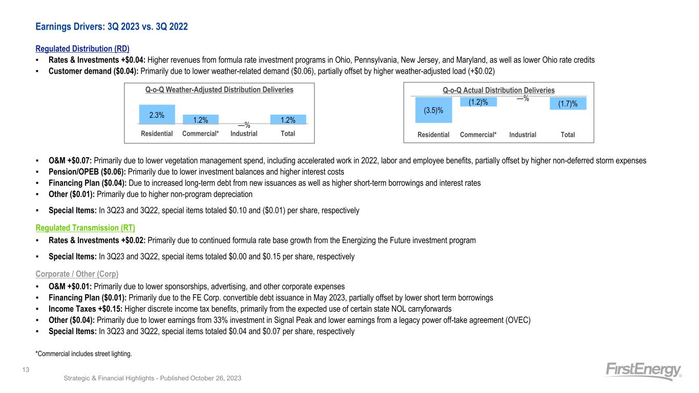 EPS Variance Analysis Regulated Regulated Corporate / FirstEnergy Corp. (in millions, except per share amounts) Distribution Transmission Other Consolidated 3Q 2022 Earnings (Loss) Attributable to FirstEnergy Corp. from Continuing Operations - GAAP $361 $27 $(54) $334 3Q 2022 Basic Earnings (Loss) from Continuing Operations Per Share - GAAP (avg. shares outstanding 571M) $0.63 $0.05 $(0.10) $0.58 Special Items - 2022 Elimination of intersegment interest on FET proceeds — (0.02) 0.02 — Exit of generation — — 0.01 0.01 Investigation and other related costs — — 0.03 0.03 Regulatory charges (0.01) 0.17 — 0.16 State tax legislative changes — — 0.01 0.01 Total Special Items - 3Q 2022 (0.01) 0.15 0.07 0.21 3Q 2022 Operating Earnings (Loss) from Continuing Operations Per Share - Non-GAAP $0.62 $0.20 $(0.03) $0.79 Rates & Investments 0.04 0.02 — 0.06 Customer Demand (0.04) — — (0.04) O&M 0.07 — 0.01 0.08 Pension/OPEB (0.06) — — (0.06) Financing Plan (0.04) — (0.01) (0.05) Income Taxes — — 0.15 0.15 Other (0.01) — (0.04) (0.05) 3Q 2023 Operating Earnings (Loss) from Continuing Operations Per Share - Non-GAAP $0.58 $0.22 $0.08 $0.88 Special Items - 2023 Enhanced employee retirement and other related costs (0.07) — — (0.07) Exit of generation — — (0.01) (0.01) FE Forward cost to achieve (0.01) — — (0.01) Investigation and other related costs — — (0.03) (0.03) Regulatory charges (0.02) — — (0.02) Total Special Items - 3Q 2023 (0.10) — (0.04) (0.14) 3Q 2023 Basic Earnings (Loss) from Continuing Operations Per Share - GAAP (avg. shares outstanding 573M) $0.48 $0.22 $0.04 $0.74 3Q 2023 Earnings (Loss) Attributable to FirstEnergy Corp. from Continuing Operations - GAAP $275 $123 $23 $421 Per share amounts for the special items and earnings drivers above and throughout this report are based on the after-tax effect of each item divided by the number of shares outstanding for the period. The current and deferred income tax effect was calculated by applying the subsidiaries' statutory tax rate to the pre-tax amount if deductible/taxable. The income tax rates range from 21% to 29% in the third quarter of 2023 and 2022. Quarterly Summary Quarterly Reconciliation 3Q 2023 3Q 2022 Change GAAP Earnings from Continuing Operations Per Basic Share $0.74 $0.58 $0.16 Special Items $0.14 $0.21 $(0.07) Operating (Non-GAAP) Earnings Per Share $0.88 $0.79 $0.09 Note: Refer to slide 3 for information on Non-GAAP Financial Matters. Strategic & Financial Highlights - Published October 26, 2023 12