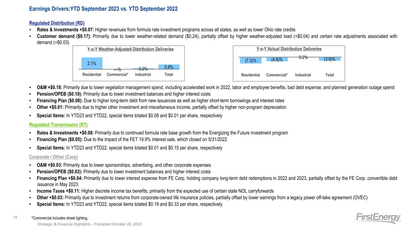 EPS Variance Analysis Regulated Regulated Corporate / FirstEnergy Corp. (in millions, except per share amounts) Distribution Transmission Other Consolidated 2022 Earnings (Loss) Attributable to FirstEnergy Corp. from Continuing Operations - (GAAP) $828 $275 $(294) $809 2022 Basic Earnings (Loss) from Continuing Operations Per Share - GAAP (avg. shares outstanding 571M) $1.45 $0.48 $(0.51) $1.42 Special Items - 2022 Debt-related costs — — 0.22 0.22 Elimination of intersegment interest on FET proceeds — (0.03) 0.03 — Exit of generation — — 0.02 0.02 FE Forward costs to achieve 0.01 — — 0.01 Investigation and other related costs — — 0.04 0.04 Regulatory charges — 0.18 — 0.18 State tax legislative changes — — 0.01 0.01 Strategic transaction charges — — 0.01 0.01 Total Special Items - 2022 0.01 0.15 0.33 0.49 2022 Operating Earnings (Loss) from Continuing Operations Per Share - Non-GAAP $1.46 $0.63 $(0.18) $1.91 Rates & Investments 0.07 0.08 — 0.15 Customer demand (0.17) — — (0.17) O&M 0.18 — 0.03 0.21 Pension/OPEB (0.19) — (0.03) (0.22) Financing Plan (including dilution from FET 19.9% interest sale) (0.08) (0.05) 0.04 (0.09) Income Taxes — — 0.11 0.11 Other 0.01 — 0.03 0.04 2023 Operating Earnings (Loss) from Continuing Operations Per Share - Non-GAAP $1.28 $0.66 $— $1.94 Special Items - 2023 Debt-related costs — — (0.05) (0.05) Enhanced employee retirement and other related costs (0.10) — — (0.10) Exit of generation — — (0.02) (0.02) FE Forward cost to achieve (0.03) — (0.04) (0.07) Investigation and other related costs — — (0.07) (0.07) Mark-to-market adjustments - Pension/OPEB actuarial assumptions 0.07 — (0.01) 0.06 Regulatory charges (0.02) (0.01) — (0.03) Total Special Items - 2023 (0.08) (0.01) (0.19) (0.28) 2023 Basic Earnings (Loss) from Continuing Operations Per Share - GAAP (avg. shares outstanding 573M) $1.20 $0.65 $(0.19) $1.66 2023 Earnings (Loss) Attributable to FirstEnergy Corp. from Continuing Operations - (GAAP) $688 $371 $(111) $948 Per share amounts for the special items and earnings drivers above and throughout this report are based on the after-tax effect of each item divided by the number of shares outstanding for the period. The current and deferred income tax effect was calculated by applying the subsidiaries' statutory tax rate to the pre-tax amount if deductible/taxable. The income tax rates range from 21% to 29% in 2023 and 2022. YTD September Summary YTD September Reconciliation 2023 2022 Change $1.66 $1.42 $0.24 $0.28 $0.49 $(0.21) GAAP Earnings from Continuing Operations Per Basic Share Special Items Operating (Non-GAAP) Earnings Per Share $1.94 $1.91 $0.03 Note: Refer to slide 3 for information on Non-GAAP Financial Matters. Strategic & Financial Highlights - Published October 26, 2023 14