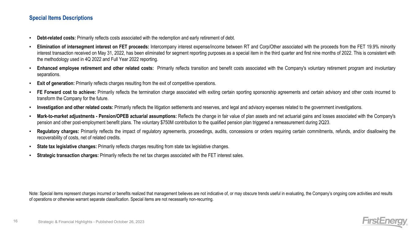 Special Items Descriptions ▪ Debt-related costs: Primarily reflects costs associated with the redemption and early retirement of debt. ▪ Elimination of intersegment interest on FET proceeds: Intercompany interest expense/income between RT and Corp/Other associated with the proceeds from the FET 19.9% minority interest transaction received on May 31, 2022, has been eliminated for segment reporting purposes as a special item in the third quarter and first nine months of 2022. This is consistent with the methodology used in 4Q 2022 and Full Year 2022 reporting. ▪ Enhanced employee retirement and other related costs: Primarily reflects transition and benefit costs associated with the Company's voluntary retirement program and involuntary separations. ▪ Exit of generation: Primarily reflects charges resulting from the exit of competitive operations. ▪ FE Forward cost to achieve: Primarily reflects the termination charge associated with exiting certain sporting sponsorship agreements and certain advisory and other costs incurred to transform the Company for the future. ▪ Investigation and other related costs: Primarily reflects the litigation settlements and reserves, and legal and advisory expenses related to the government investigations. ▪ Mark-to-market adjustments - Pension/OPEB actuarial assumptions: Reflects the change in fair value of plan assets and net actuarial gains and losses associated with the Company's pension and other post-employment benefit plans. The voluntary $750M contribution to the qualified pension plan triggered a remeasurement during 2Q23. ▪ Regulatory charges: Primarily reflects the impact of regulatory agreements, proceedings, audits, concessions or orders requiring certain commitments, refunds, and/or disallowing the recoverability of costs, net of related credits. ▪ State tax legislative changes: Primarily reflects charges resulting from state tax legislative changes. ▪ Strategic transaction charges: Primarily reflects the net tax charges associated with the FET interest sales. Note: Special items represent charges incurred or benefits realized that management believes are not indicative of, or may obscure trends useful in evaluating, the Company’s ongoing core activities and results of operations or otherwise warrant separate classification. Special items are not necessarily non-recurring. Strategic & Financial Highlights - Published October 26, 202316