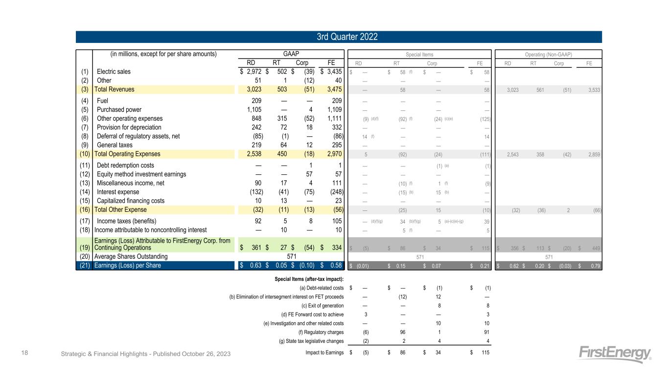 3rd Quarter 2022 (in millions, except for per share amounts) GAAP Special Items Operating (Non-GAAP) RD RT Corp FE RD RT Corp FE RD RT Corp FE (1) Electric sales $ 2,972 $ 502 $ (39) $ 3,435 $ — $ 58 (f) $ — $ 58 $ 2,972 $ 560 $ (39) $ 3,493 (2) Other 51 1 (12) 40 — — — — 51 1 (12) 40 (3) Total Revenues 3,023 503 (51) 3,475 — 58 — 58 3,023 561 (51) 3,533 (4) Fuel 209 — — 209 — — — — 209 — — 209 (5) Purchased power 1,105 — 4 1,109 — — — — 1,105 — 4 1,109 (6) Other operating expenses 848 315 (52) 1,111 (9) (d)(f) (92) (f) (24) (c)(e) (125) 839 223 (76) 986 (7) Provision for depreciation 242 72 18 332 — — — — 242 72 18 332 (8) Deferral of regulatory assets, net (85) (1) — (86) 14 (f) — — 14 (71) (1) — (72) (9) General taxes 219 64 12 295 — — — — 219 64 12 295 (10) Total Operating Expenses 2,538 450 (18) 2,970 5 (92) (24) (111) 2,543 358 (42) 2,859 (11) Debt redemption costs — — 1 1 — — (1) (a) (1) — — — — (12) Equity method investment earnings — — 57 57 — — — — — — 57 57 (13) Miscellaneous income, net 90 17 4 111 — (10) (f) 1 (f) (9) 90 7 5 102 (14) Interest expense (132) (41) (75) (248) — (15) (b) 15 (b) — (132) (56) (60) (248) (15) Capitalized financing costs 10 13 — 23 — — — — 10 13 — 23 (16) Total Other Expense (32) (11) (13) (56) — (25) 15 (10) (32) (36) 2 (66) (17) Income taxes (benefits) 92 5 8 105 — (d)(f)(g) 34 (b)(f)(g) 5 (a)-(c)(e)-(g) 39 92 39 13 144 (18) Income attributable to noncontrolling interest — 10 — 10 — 5 (f) — 5 — 15 — 15 (19) Earnings (Loss) Attributable to FirstEnergy Corp. from Continuing Operations $ 361 $ 27 $ (54) $ 334 $ (5) $ 86 $ 34 $ 115 $ 356 $ 113 $ (20) $ 449 (20) Average Shares Outstanding 571 571 571 (21) Earnings (Loss) per Share $ 0.63 $ 0.05 $ (0.10) $ 0.58 $ (0.01) $ 0.15 $ 0.07 $ 0.21 $ 0.62 $ 0.20 $ (0.03) $ 0.79 Special Items (after-tax impact): (a) Debt-related costs $ — $ — $ (1) $ (1) (b) Elimination of intersegment interest on FET proceeds — (12) 12 — (c) Exit of generation — — 8 8 (d) FE Forward cost to achieve 3 — — 3 (e) Investigation and other related costs — — 10 10 (f) Regulatory charges (6) 96 1 91 (g) State tax legislative changes (2) 2 4 4 Impact to Earnings $ (5) $ 86 $ 34 $ 115 Strategic & Financial Highlights - Published October 26, 202318