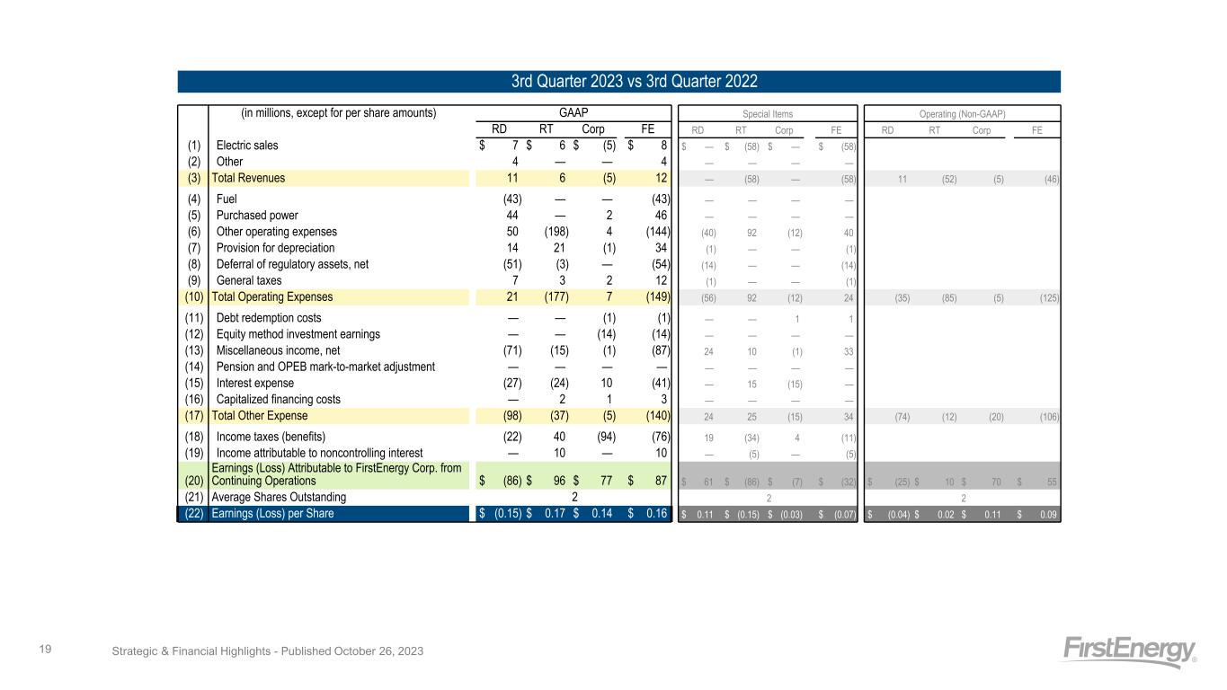 3rd Quarter 2023 vs 3rd Quarter 2022 (in millions, except for per share amounts) GAAP Special Items Operating (Non-GAAP) RD RT Corp FE RD RT Corp FE RD RT Corp FE (1) Electric sales $ 7 $ 6 $ (5) $ 8 $ — $ (58) $ — $ (58) $ 7 $ (52) $ (5) $ (50) (2) Other 4 — — 4 — — — — 4 — — 4 (3) Total Revenues 11 6 (5) 12 — (58) — (58) 11 (52) (5) (46) (4) Fuel (43) — — (43) — — — — (43) — — (43) (5) Purchased power 44 — 2 46 — — — — 44 — 2 46 (6) Other operating expenses 50 (198) 4 (144) (40) 92 (12) 40 10 (106) (8) (104) (7) Provision for depreciation 14 21 (1) 34 (1) — — (1) 13 21 (1) 33 (8) Deferral of regulatory assets, net (51) (3) — (54) (14) — — (14) (65) (3) — (68) (9) General taxes 7 3 2 12 (1) — — (1) 6 3 2 11 (10) Total Operating Expenses 21 (177) 7 (149) (56) 92 (12) 24 (35) (85) (5) (125) (11) Debt redemption costs — — (1) (1) — — 1 1 — — — — (12) Equity method investment earnings — — (14) (14) — — — — — — (14) (14) (13) Miscellaneous income, net (71) (15) (1) (87) 24 10 (1) 33 (47) (5) (2) (54) (14) Pension and OPEB mark-to-market adjustment — — — — — — — — — — — — (15) Interest expense (27) (24) 10 (41) — 15 (15) — (27) (9) (5) (41) (16) Capitalized financing costs — 2 1 3 — — — — — 2 1 3 (17) Total Other Expense (98) (37) (5) (140) 24 25 (15) 34 (74) (12) (20) (106) (18) Income taxes (benefits) (22) 40 (94) (76) 19 (34) 4 (11) (3) 6 (90) (87) (19) Income attributable to noncontrolling interest — 10 — 10 — (5) — (5) — 5 — 5 (20) Earnings (Loss) Attributable to FirstEnergy Corp. from Continuing Operations $ (86) $ 96 $ 77 $ 87 $ 61 $ (86) $ (7) $ (32) $ (25) $ 10 $ 70 $ 55 (21) Average Shares Outstanding 2 2 2 (22) Earnings (Loss) per Share $ (0.15) $ 0.17 $ 0.14 $ 0.16 $ 0.11 $ (0.15) $ (0.03) $ (0.07) $ (0.04) $ 0.02 $ 0.11 $ 0.09 Strategic & Financial Highlights - Published October 26, 202319
