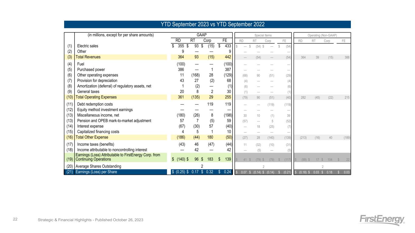 YTD September 2023 vs YTD September 2022 (in millions, except for per share amounts) GAAP Special Items Operating (Non-GAAP) RD RT Corp FE RD RT Corp FE RD RT Corp FE (1) Electric sales $ 355 $ 93 $ (15) $ 433 $ — $ (54) $ — $ (54) $ 355 $ 39 $ (15) $ 379 (2) Other 9 — — 9 — — — — 9 — — 9 (3) Total Revenues 364 93 (15) 442 — (54) — (54) 364 39 (15) 388 (4) Fuel (100) — — (100) — — — — (100) — — (100) (5) Purchased power 386 — 1 387 — — — — 386 — 1 387 (6) Other operating expenses 11 (168) 28 (129) (68) 90 (51) (29) (57) (78) (23) (158) (7) Provision for depreciation 43 27 (2) 68 (4) — — (4) 39 27 (2) 64 (8) Amortization (deferral) of regulatory assets, net 1 (2) — (1) (6) — — (6) (5) (2) — (7) (9) General taxes 20 8 2 30 (1) — — (1) 19 8 2 29 (10) Total Operating Expenses 361 (135) 29 255 (79) 90 (51) (40) 282 (45) (22) 215 (11) Debt redemption costs — — 119 119 — — (119) (119) — — — — (12) Equity method investment earnings — — — — — — — — — — — — (13) Miscellaneous income, net (180) (26) 8 (198) 30 10 (1) 39 (150) (16) 7 (159) (13) Pension and OPEB mark-to-market adjustment 57 7 (5) 59 (57) — 5 (52) — 7 — 7 (14) Interest expense (67) (30) 57 (40) — 18 (25) (7) (67) (12) 32 (47) (15) Capitalized financing costs 4 5 1 10 — — — — 4 5 1 10 (16) Total Other Expense (186) (44) 180 (50) (27) 28 (140) (139) (213) (16) 40 (189) (17) Income taxes (benefits) (43) 46 (47) (44) 11 (32) (10) (31) (32) 14 (57) (75) (18) Income attributable to noncontrolling interest — 42 — 42 — (5) — (5) — 37 — 37 (19) Earnings (Loss) Attributable to FirstEnergy Corp. from Continuing Operations $ (140) $ 96 $ 183 $ 139 $ 41 $ (79) $ (79) $ (117) $ (99) $ 17 $ 104 $ 22 (20) Average Shares Outstanding 2 2 2 (21) Earnings (Loss) per Share $ (0.25) $ 0.17 $ 0.32 $ 0.24 $ 0.07 $ (0.14) $ (0.14) $ (0.21) $ (0.18) $ 0.03 $ 0.18 $ 0.03 Strategic & Financial Highlights - Published October 26, 202322