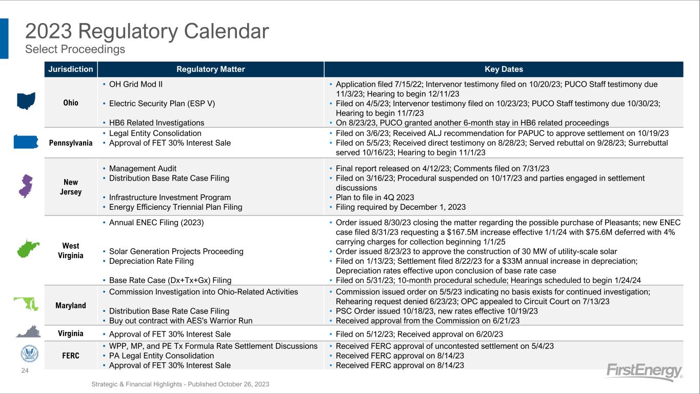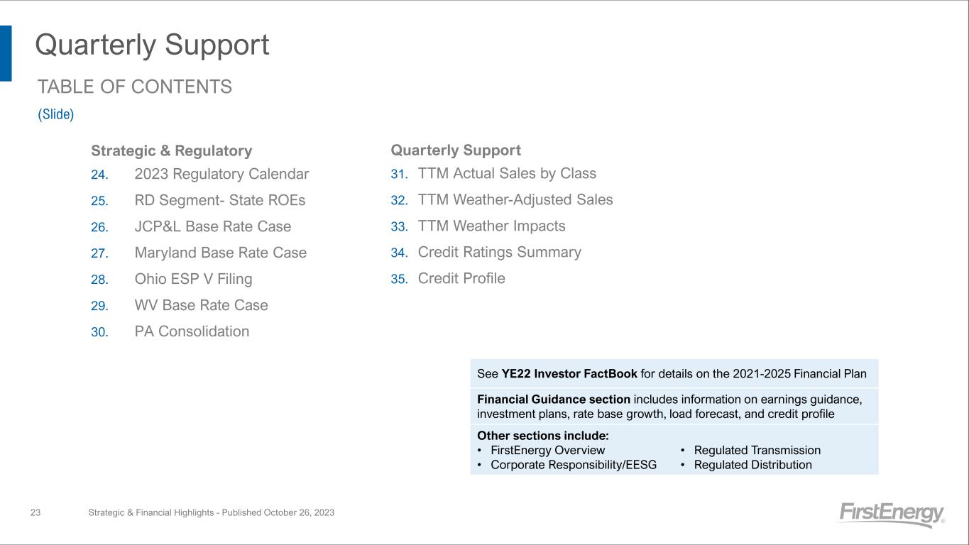 Quarterly Support Strategic & Financial Highlights - Published October 26, 2023 Strategic & Regulatory 24. 2023 Regulatory Calendar 25. RD Segment- State ROEs 26. JCP&L Base Rate Case 27. Maryland Base Rate Case 28. Ohio ESP V Filing 29. WV Base Rate Case 30. PA Consolidation TABLE OF CONTENTS (Slide) 23 Quarterly Support 31. TTM Actual Sales by Class 32. TTM Weather-Adjusted Sales 33. TTM Weather Impacts 34. Credit Ratings Summary 35. Credit Profile See YE22 Investor FactBook for details on the 2021-2025 Financial Plan Financial Guidance section includes information on earnings guidance, investment plans, rate base growth, load forecast, and credit profile Other sections include: • FirstEnergy Overview • Corporate Responsibility/EESG • Regulated Transmission • Regulated Distribution