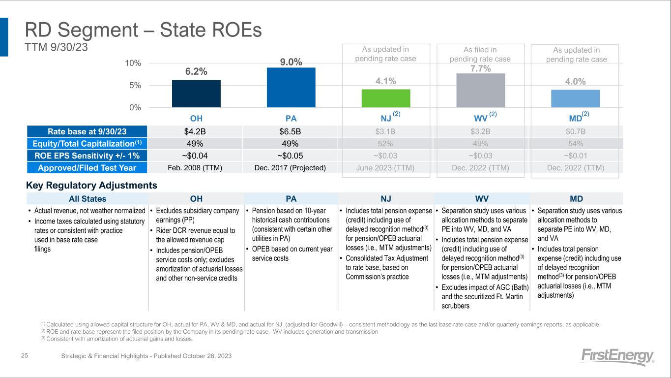 Jurisdiction Regulatory Matter Key Dates Ohio • OH Grid Mod II • Electric Security Plan (ESP V) • HB6 Related Investigations • Application filed 7/15/22; Intervenor testimony filed on 10/20/23; PUCO Staff testimony due 11/3/23; Hearing to begin 12/11/23 • Filed on 4/5/23; Intervenor testimony filed on 10/23/23; PUCO Staff testimony due 10/30/23; Hearing to begin 11/7/23 • On 8/23/23, PUCO granted another 6-month stay in HB6 related proceedings Pennsylvania • Legal Entity Consolidation • Approval of FET 30% Interest Sale • Filed on 3/6/23; Received ALJ recommendation for PAPUC to approve settlement on 10/19/23 • Filed on 5/5/23; Received direct testimony on 8/28/23; Served rebuttal on 9/28/23; Surrebuttal served 10/16/23; Hearing to begin 11/1/23 New Jersey • Management Audit • Distribution Base Rate Case Filing • Infrastructure Investment Program • Energy Efficiency Triennial Plan Filing • Final report released on 4/12/23; Comments filed on 7/31/23 • Filed on 3/16/23; Procedural suspended on 10/17/23 and parties engaged in settlement discussions • Plan to file in 4Q 2023 • Filing required by December 1, 2023 West Virginia • Annual ENEC Filing (2023) • Solar Generation Projects Proceeding • Depreciation Rate Filing • Base Rate Case (Dx+Tx+Gx) Filing • Order issued 8/30/23 closing the matter regarding the possible purchase of Pleasants; new ENEC case filed 8/31/23 requesting a $167.5M increase effective 1/1/24 with $75.6M deferred with 4% carrying charges for collection beginning 1/1/25 • Order issued 8/23/23 to approve the construction of 30 MW of utility-scale solar • Filed on 1/13/23; Settlement filed 8/22/23 for a $33M annual increase in depreciation; Depreciation rates effective upon conclusion of base rate case • Filed on 5/31/23; 10-month procedural schedule; Hearings scheduled to begin 1/24/24 Maryland • Commission Investigation into Ohio-Related Activities • Distribution Base Rate Case Filing • Buy out contract with AES's Warrior Run • Commission issued order on 5/5/23 indicating no basis exists for continued investigation; Rehearing request denied 6/23/23; OPC appealed to Circuit Court on 7/13/23 • PSC Order issued 10/18/23, new rates effective 10/19/23 • Received approval from the Commission on 6/21/23 Virginia • Approval of FET 30% Interest Sale • Filed on 5/12/23; Received approval on 6/20/23 FERC • WPP, MP, and PE Tx Formula Rate Settlement Discussions • PA Legal Entity Consolidation • Approval of FET 30% Interest Sale • Received FERC approval of uncontested settlement on 5/4/23 • Received FERC approval on 8/14/23 • Received FERC approval on 8/14/23 2023 Regulatory Calendar Select Proceedings Strategic & Financial Highlights - Published October 26, 2023 24