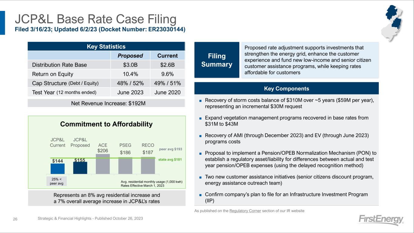 JCP&L Base Rate Case Filing Filed 3/16/23; Updated 6/2/23 (Docket Number: ER23030144) Key Statistics Proposed Current Distribution Rate Base $3.0B $2.6B Return on Equity 10.4% 9.6% Cap Structure (Debt / Equity) 48% / 52% 49% / 51% Test Year (12 months ended) June 2023 June 2020 Net Revenue Increase: $185M $144 $155 $206 $186 $187 JCP&L Current JCP&L Proposed ACE PSEG RECO Commitment to Affordability 25% < peer avg Key Components ■ Recovery of storm costs balance of $310M over ~5 years ($59M per year), representing an incremental $30M request ■ Expand vegetation management programs recovered in base rates from $31M to $43M ■ Recovery of AMI (through December 2023) and EV (through June 2023) programs costs ■ Proposal to implement a Pension/OPEB Normalization Mechanism (PON) to establish a regulatory asset/liability for differences between actual and test year pension/OPEB expenses (using the delayed recognition method) ■ Two new customer assistance initiatives (senior citizens discount program, energy assistance outreach team) ■ Confirm company’s plan to file for an Infrastructure Investment Program (IIP) Filing Summary Proposed rate adjustment supports investments that strengthen the energy grid, enhance the customer experience and fund new low-income and senior citizen customer assistance programs, while keeping rates affordable for customers Avg. residential monthly usage (1,000 kwh) Rates Effective March 1, 2023 state avg $181 peer avg $193 Represents an 8% avg residential increase and a 7% overall average increase in JCP&L’s rates As published on the Regulatory Corner section of our IR website i i i t i ti t . . t it . . t t ( t / it ) / / t ( t ) t I : 92 Strategic & Financial Highlights - Published October 26, 202326