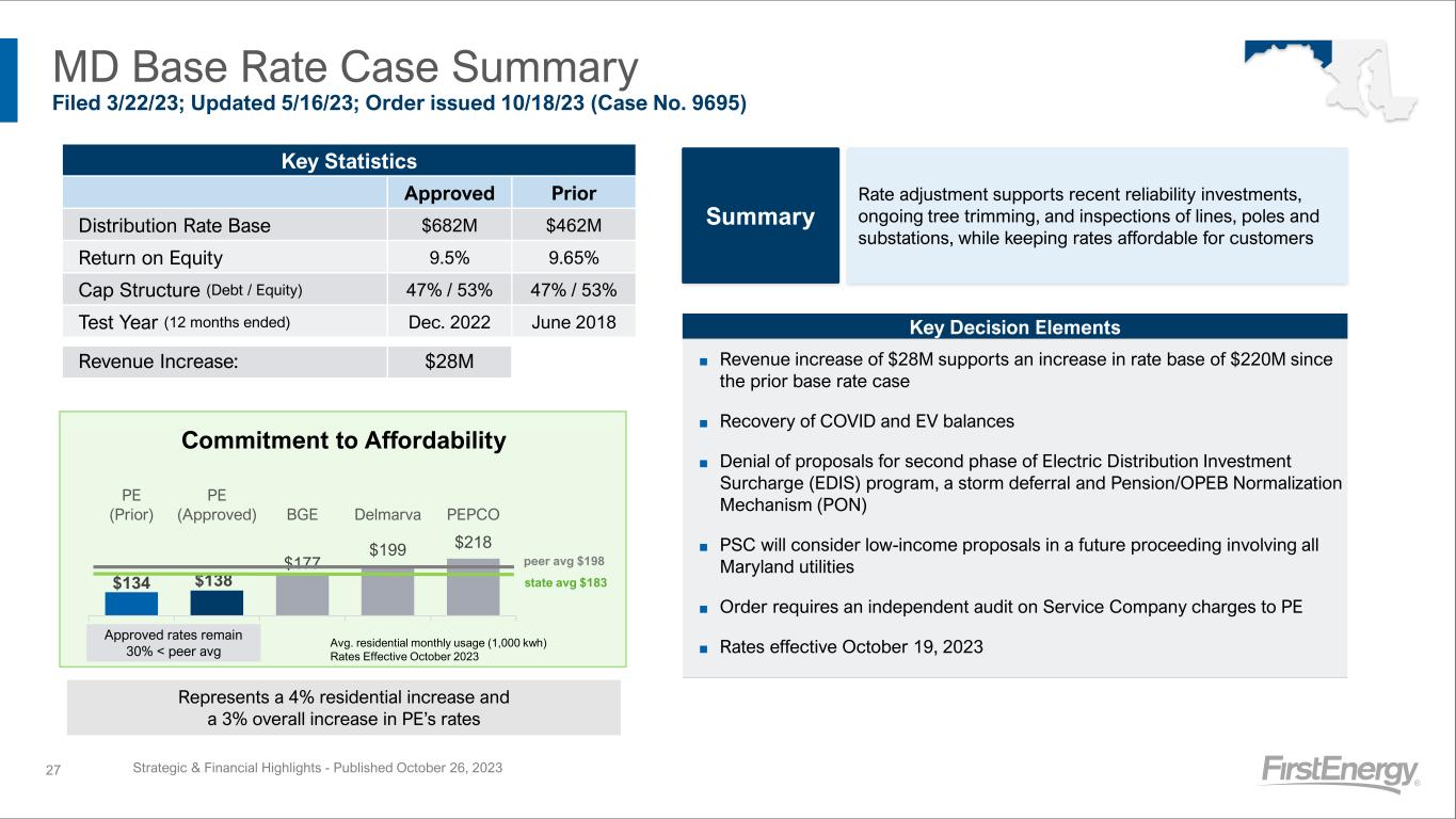 Key Decision Elements ■ Revenue increase of $28M supports an increase in rate base of $220M since the prior base rate case ■ Recovery of COVID and EV balances ■ Denial of proposals for second phase of Electric Distribution Investment Surcharge (EDIS) program, a storm deferral and Pension/OPEB Normalization Mechanism (PON) ■ PSC will consider low-income proposals in a future proceeding involving all Maryland utilities ■ Order requires an independent audit on Service Company charges to PE ■ Rates effective October 19, 2023 Represents a 4% residential increase and a 3% overall increase in PE’s rates MD Base Rate Case Summary Filed 3/22/23; Updated 5/16/23; Order issued 10/18/23 (Case No. 9695) Key Statistics Approved Prior Distribution Rate Base $682M $462M Return on Equity 9.5% 9.65% Cap Structure (Debt / Equity) 47% / 53% 47% / 53% Test Year (12 months ended) Dec. 2022 June 2018 Revenue Increase: $28M $134 $138 $177 $199 $218 PE (Prior) PE (Approved) BGE Delmarva PEPCO Commitment to Affordability Approved rates remain 30% < peer avg Summary Rate adjustment supports recent reliability investments, ongoing tree trimming, and inspections of lines, poles and substations, while keeping rates affordable for customers Avg. residential monthly usage (1,000 kwh) Rates Effective October 2023 state avg $183 peer avg $198 Strategic & Financial Highlights - Published October 26, 202327