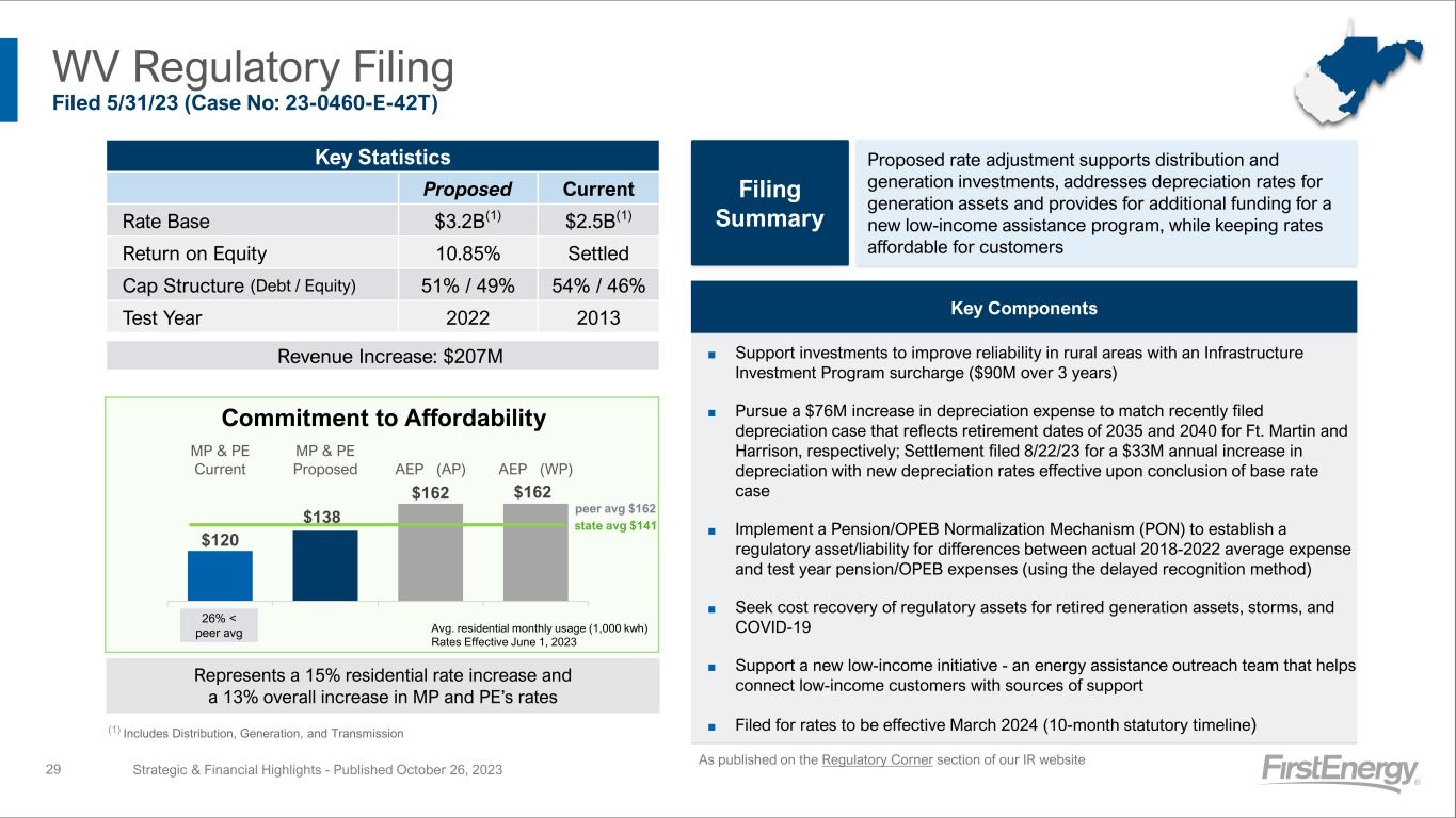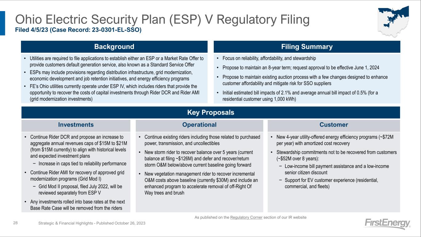 Ohio Electric Security Plan (ESP) V Regulatory Filing Filed 4/5/23 (Case Record: 23-0301-EL-SSO) Strategic & Financial Highlights - Published October 26, 202328 As published on the Regulatory Corner section of our IR website Background • Utilities are required to file applications to establish either an ESP or a Market Rate Offer to provide customers default generation service, also known as a Standard Service Offer • ESPs may include provisions regarding distribution infrastructure, grid modernization, economic development and job retention initiatives, and energy efficiency programs • FE’s Ohio utilities currently operate under ESP IV, which includes riders that provide the opportunity to recover the costs of capital investments through Rider DCR and Rider AMI (grid modernization investments) Filing Summary • Focus on reliability, affordability, and stewardship • Propose to maintain an 8-year term; request approval to be effective June 1, 2024 • Propose to maintain existing auction process with a few changes designed to enhance customer affordability and mitigate risk for SSO suppliers • Initial estimated bill impacts of 2.1% and average annual bill impact of 0.5% (for a residential customer using 1,000 kWh) Key Proposals Investments Operational Customer • Continue Rider DCR and propose an increase to aggregate annual revenues caps of $15M to $21M (from $15M currently) to align with historical levels and expected investment plans − Increase in caps tied to reliability performance • Continue Rider AMI for recovery of approved grid modernization programs (Grid Mod I) − Grid Mod II proposal, filed July 2022, will be reviewed separately from ESP V • Any investments rolled into base rates at the next Base Rate Case will be removed from the riders • Continue existing riders including those related to purchased power, transmission, and uncollectibles • New storm rider to recover balance over 5 years (current balance at filing ~$126M) and defer and recover/return storm O&M below/above current baseline going forward • New vegetation management rider to recover incremental O&M costs above baseline (currently $30M) and include an enhanced program to accelerate removal of off-Right Of Way trees and brush • New 4-year utility-offered energy efficiency programs (~$72M per year) with amortized cost recovery • Stewardship commitments not to be recovered from customers (~$52M over 8 years): − Low-income bill payment assistance and a low-income senior citizen discount − Support for EV customer experience (residential, commercial, and fleets)